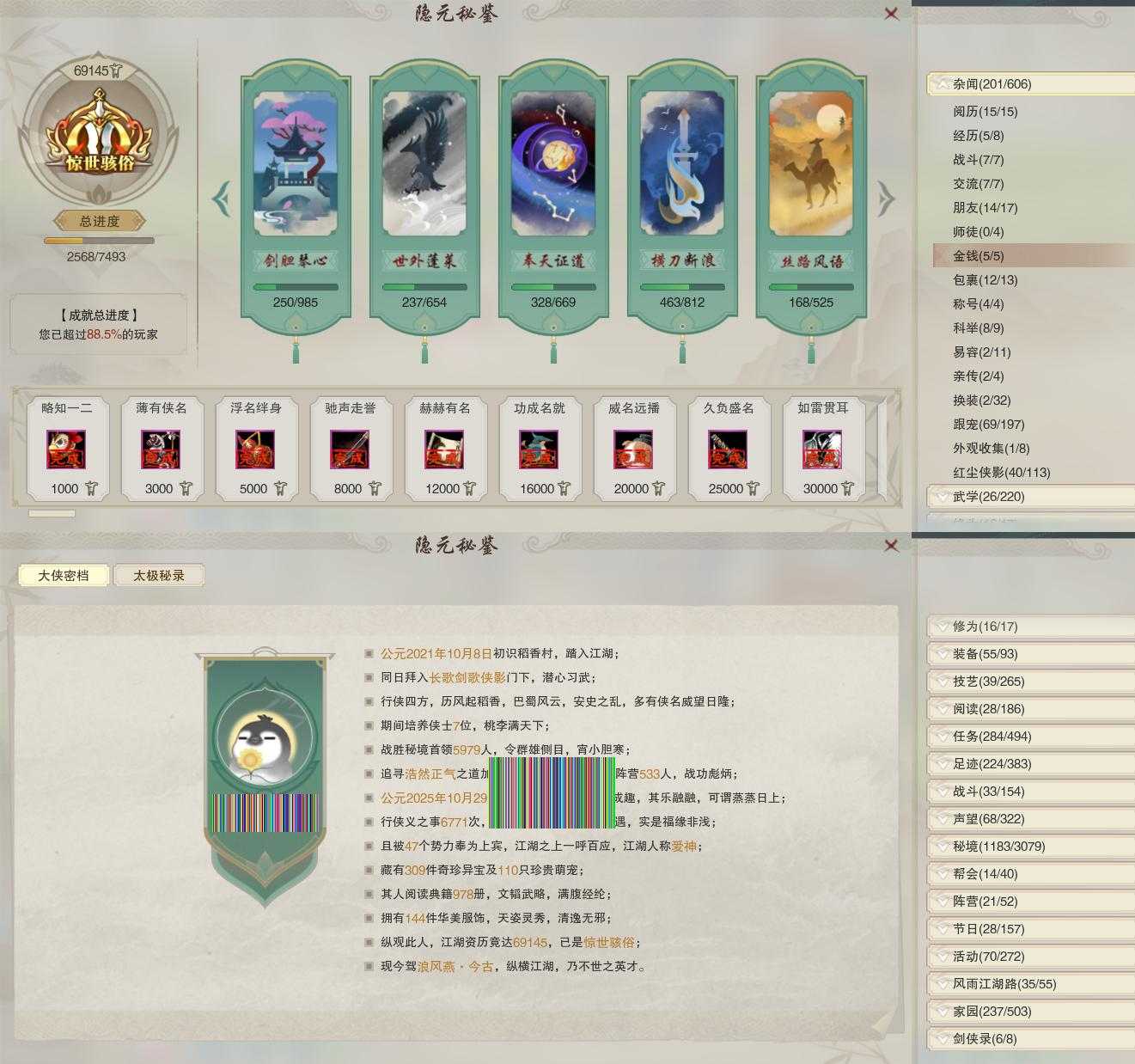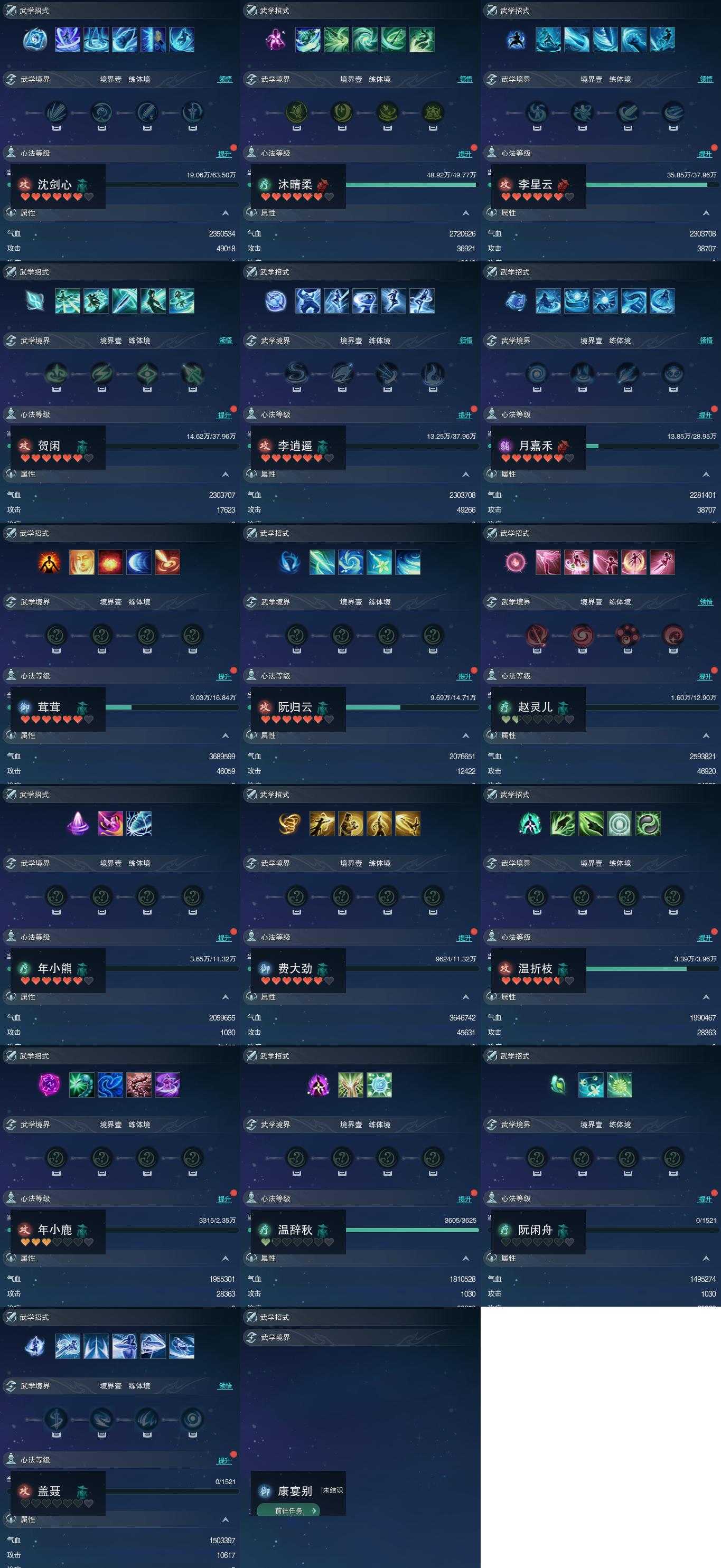 【同伴】沈剑心82级境界壹,沐晴柔79级境界壹,李星云77级境界壹,贺闲77级境界壹,李逍遥77级境界壹,月嘉禾75级境界壹,茸茸71级境界壹,阮归云70级境界壹,赵灵儿69级境界壹,年小熊68级境界壹,费大劲68级境界壹,温折枝60级境界壹,年小鹿56级境界壹,温辞秋39级境界壹,阮闲舟1级境界壹,盖聂1级境界壹,康宴别级