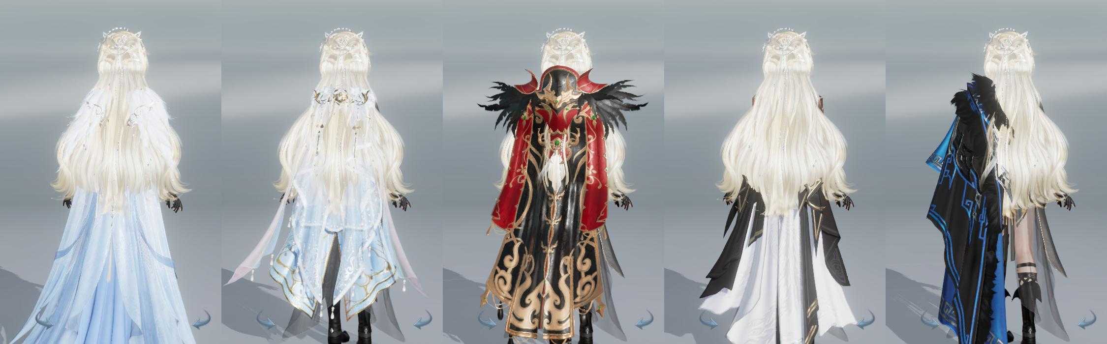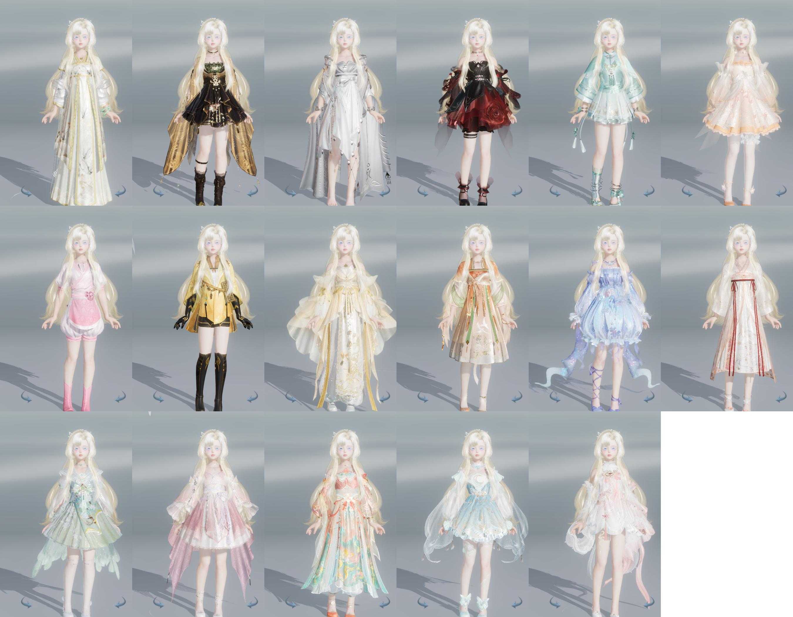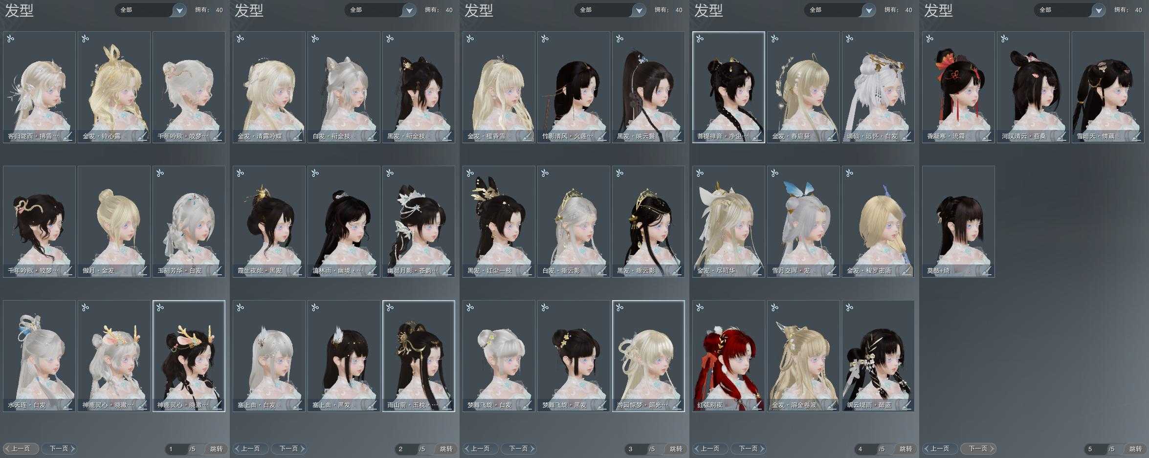 【发型】金发10个[资历金, 鼠金, 中秋金, 蝶金, 一代灰金, 水母金, 铃金, 傲月金发, 白游园金发, 白陇西金发], 红发1个[鸡红], 黑发21个, 白发11个, 盒子发型[雪月白发, 黑谪仙白发, 净尘黑发, 澄琼枝黑发, 白游园黑发, 小熊黑发, 十二黑, 小熊白发, 红六七白发, 竹影火莲黑发, 白雨山前黑发, 绿幽昙黑发, 黑傣族黑发, 粉鹿黑发, 粉鹿白发, 白蛇盒黑发, 白蛇盒白发], 总页数5