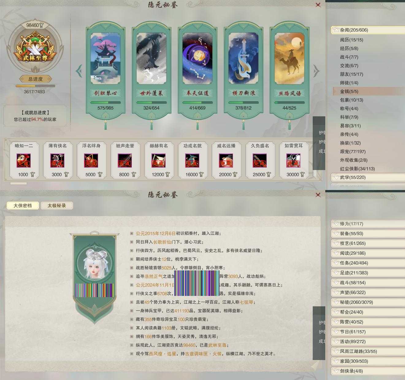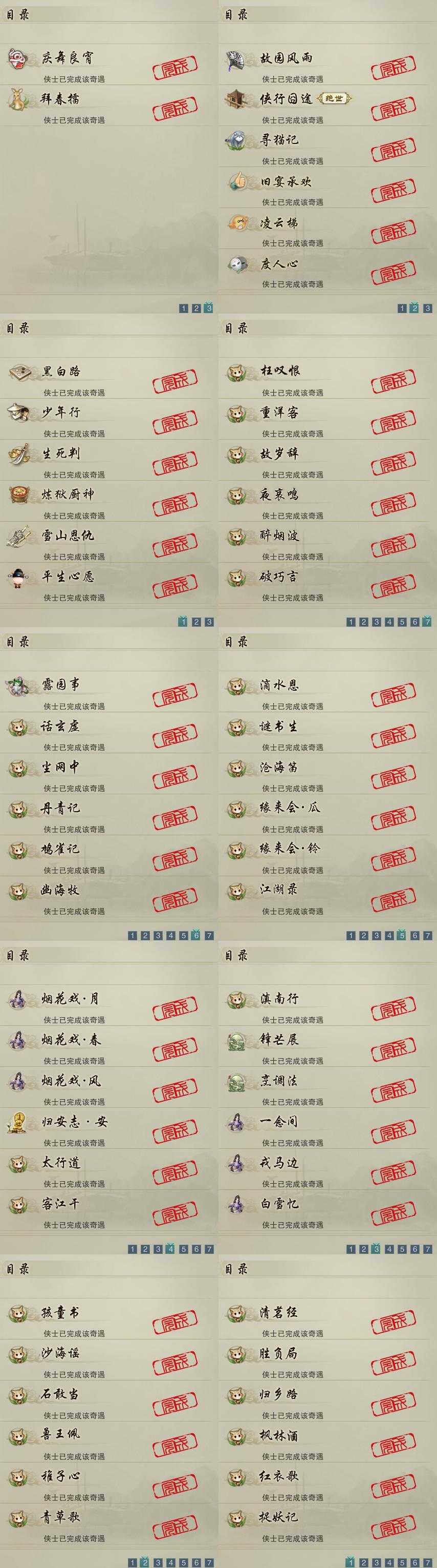 【奇遇】14个[雪山恩仇, 黑白路, 平生心愿, 少年行, 故园风雨, 侠行囧途, 寻猫记, 庆舞良宵, 生死判, 凌云梯, 炼狱厨神, 度人心, 旧宴承欢, 拜春擂]