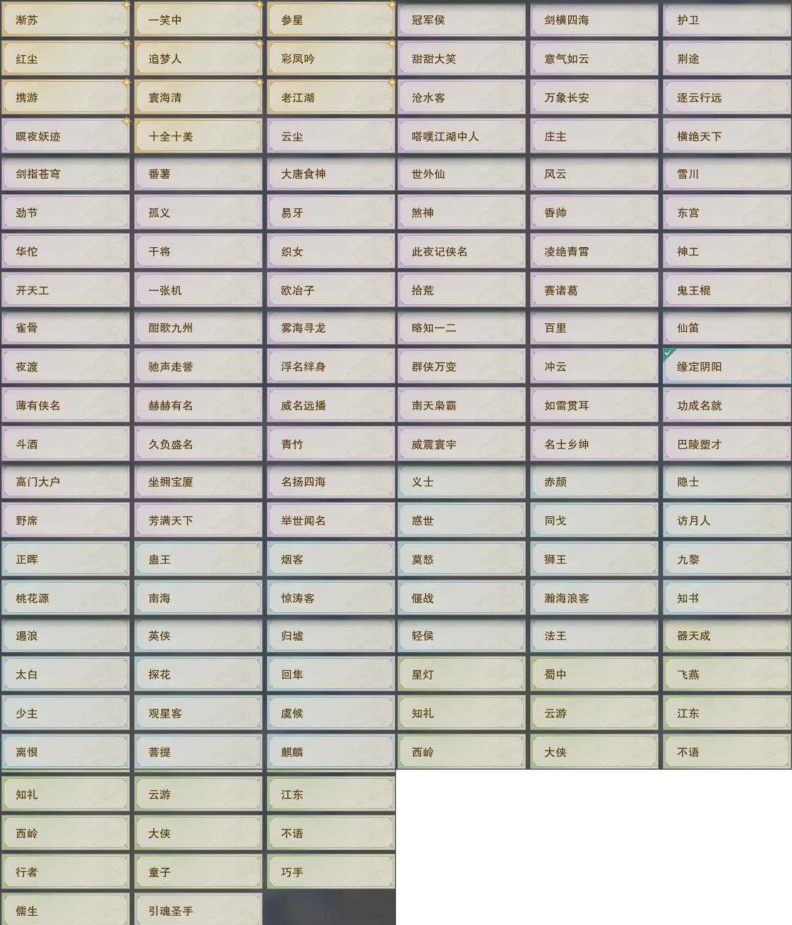 【称号】[济世菩萨, 无上正等正觉, 紫宫绛河, 北斗星曜, 知凝, 幽梦引, 游茵, 纵江湖, 侠万里, 焰莲隐客, 夜昙帝华, 迷仙蝶梦, 梦蝶, 灵蕊, 月凝, 飞熊, 小飞熊, 凶虎, 小凶虎, 萌猫, 小萌猫, 魅影, 汝有梦想乎, 无惧, 惑梦, 几魂梦]