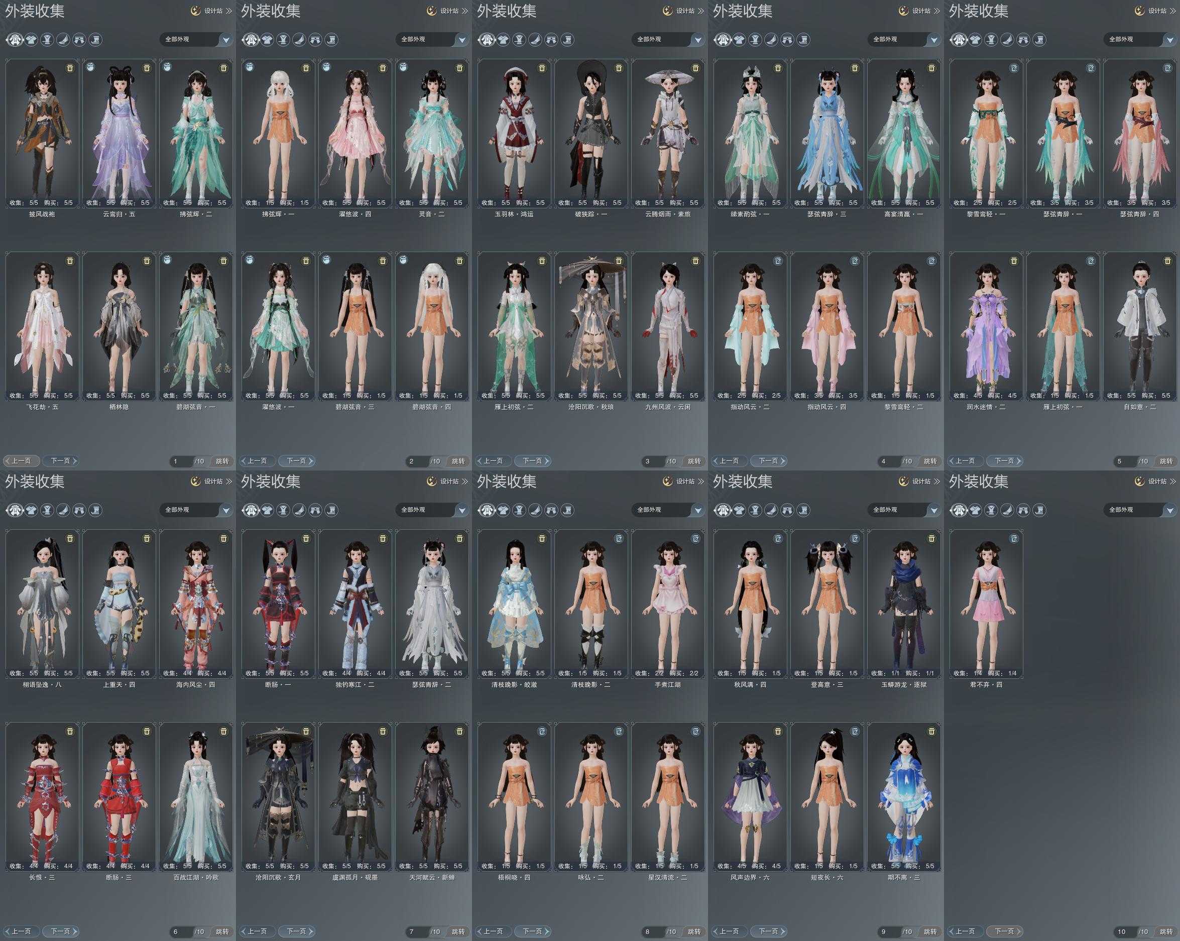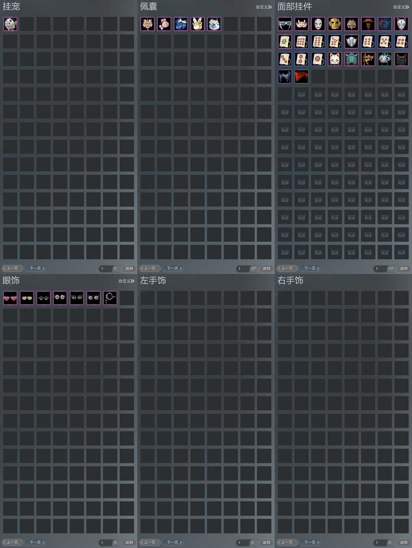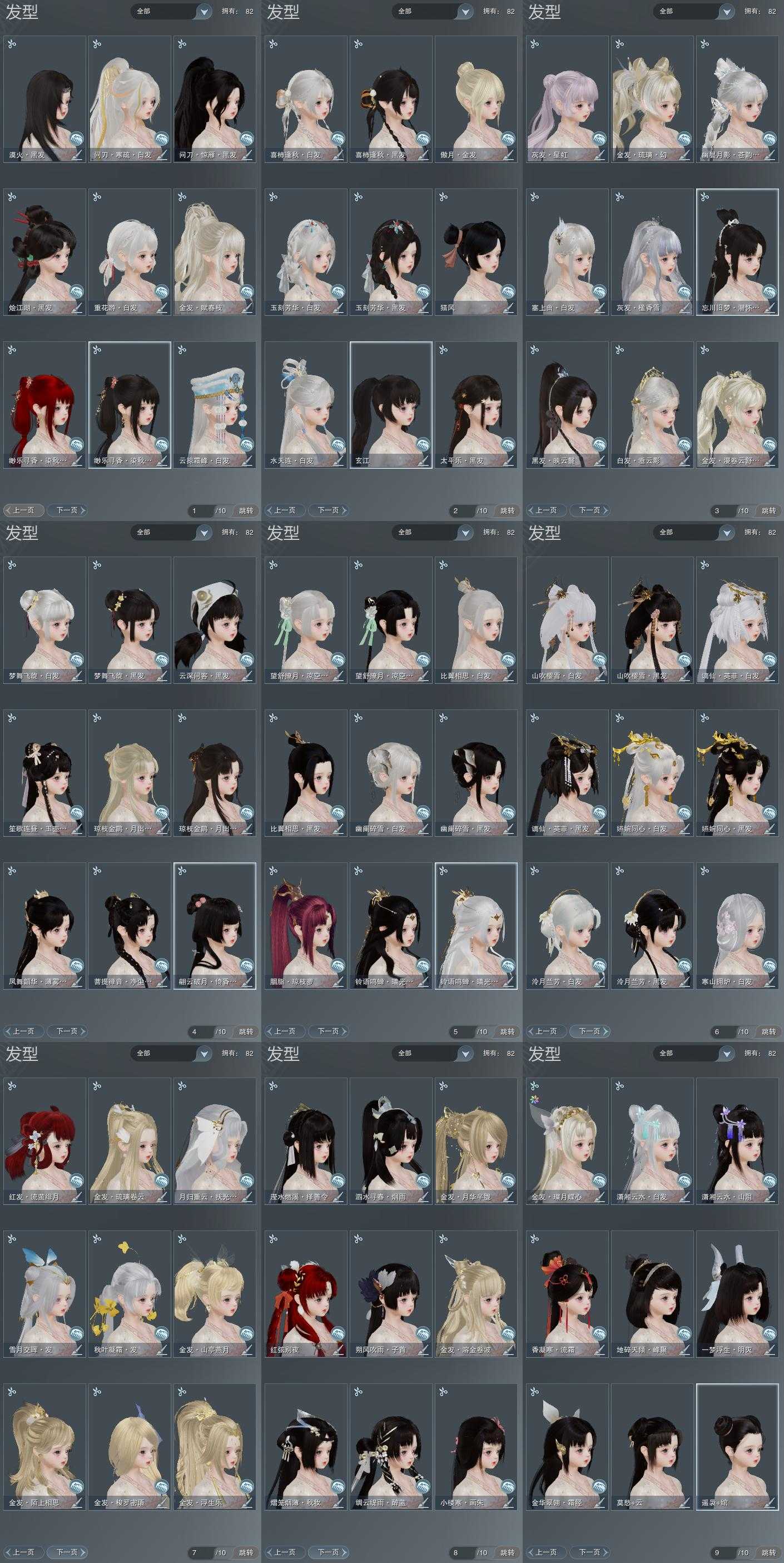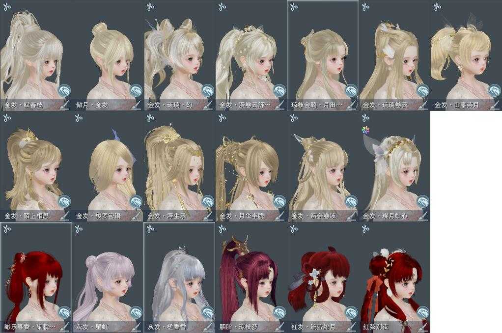 【发型】金发13个[狐金, 资历金, 鸡金, 蝶金, 喵金, 考金, 国金, 龙女金, 云金, 海金, 傲月金发, 蛇金, 澄琼枝金发], 红发6个[紫发, 鸡红, 小资历红, 红寻香红发, 二代灰, 一代灰], 黑发37个, 白发23个, 盒子发型[泠月黑发, 一代重阳白, 四代七夕黑发, 狗白, 绿谪仙黑发, 雪月白发, 山吹樱雪黑发, 棉袄白, 白楼兰黑发, 泠月白发, 四代七夕白发, 幽阑黑发, 五代七夕黑发, 绿中秋黑发, 绿谪仙白发, 山吹樱雪白发, 粉同人黑发, 白楼兰白发, 净尘黑发, 幽阑白发, 五代七夕白发, 薄雾黑发, 绿中秋白发, 澄琼枝黑发, 唐风玉壶黑发, 小熊黑发, 小熊白发, 白忘川黑发, 绿幽昙白发, 柿盒黑发, 柿盒白发, 红寻香黑发, 云掠霜峰白发, 红问刀黑发, 重花游白发, 黄问刀白发], 总页数10