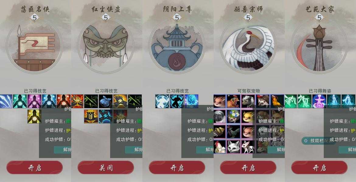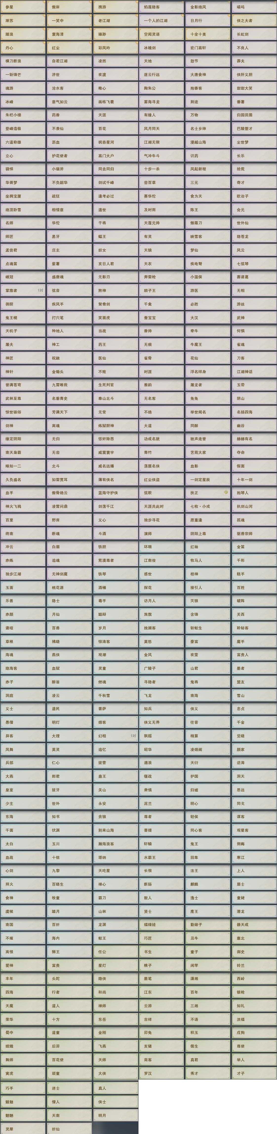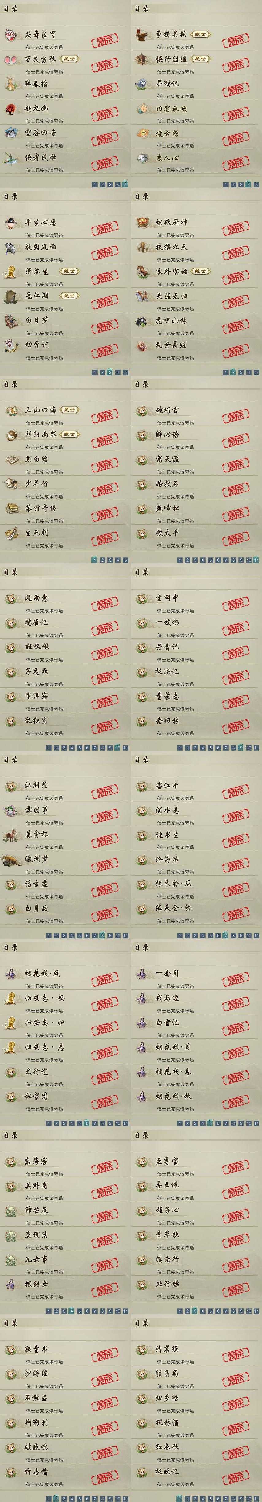 【奇遇】30个[白日梦, 天涯无归, 三山四海, 劝学记, 阴阳两界, 平生心愿, 兔江湖, 黑白路, 塞外宝驹, 乱世舞姬, 争铸吴钩, 虎啸山林, 济苍生, 少年行, 故园风雨, 扶摇九天, 侠行囧途, 寻猫记, 茶馆奇缘, 庆舞良宵, 万灵当歌, 生死判, 凌云梯, 炼狱厨神, 赴九幽, 度人心, 空谷回音, 旧宴承欢, 侠者成歌, 拜春擂]