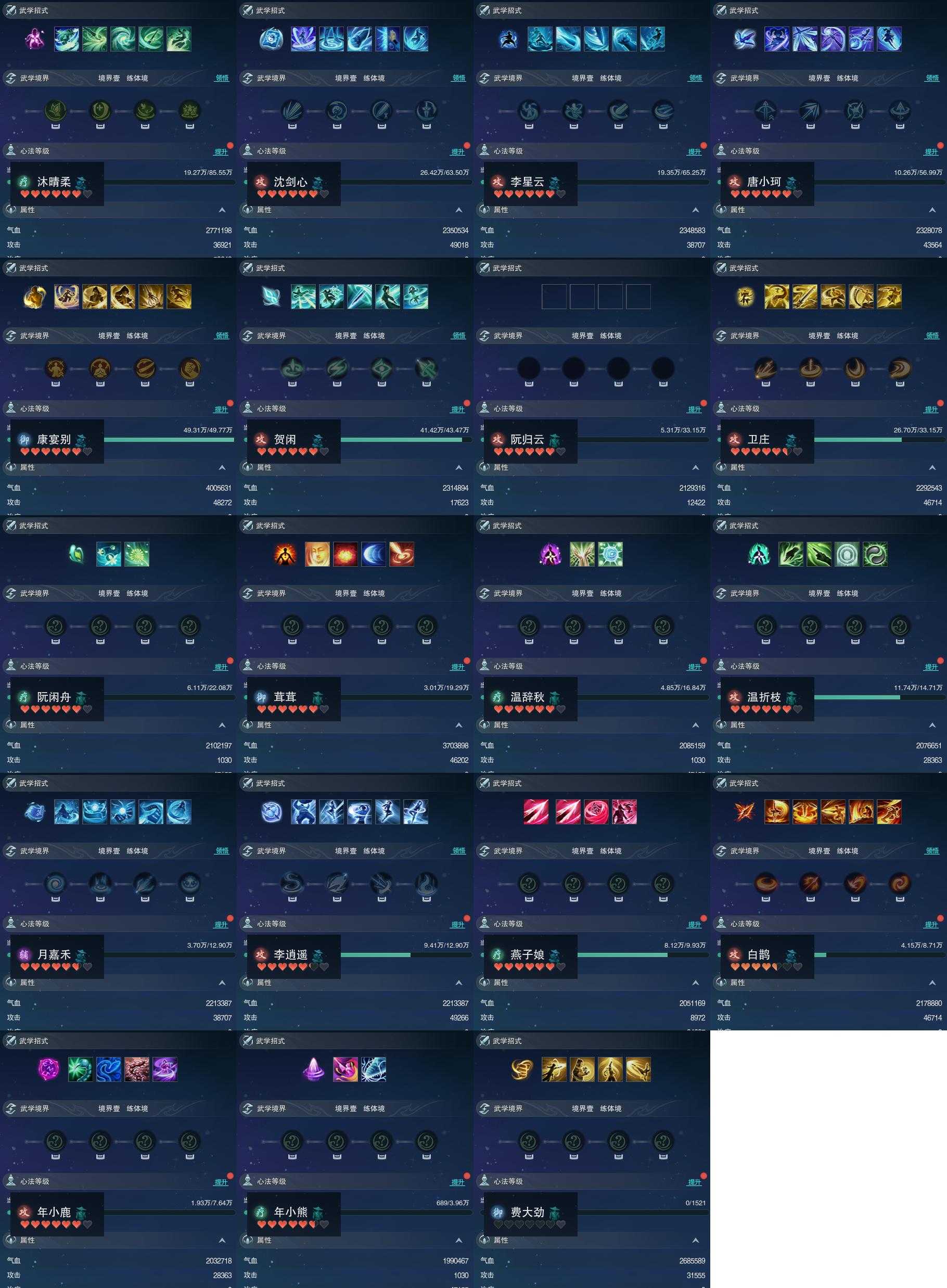 【同伴】沐晴柔83级境界壹,沈剑心82级境界壹,李星云81级境界壹,唐小珂80级境界壹,康宴别79级境界壹,贺闲78级境界壹,阮归云76级境界壹,卫庄76级境界壹,阮闲舟73级境界壹,茸茸72级境界壹,温辞秋71级境界壹,温折枝70级境界壹,月嘉禾69级境界壹,李逍遥69级境界壹,燕子娘67级境界壹,白鹊66级境界壹,年小鹿65级境界壹,年小熊60级境界壹,费大劲1级境界壹