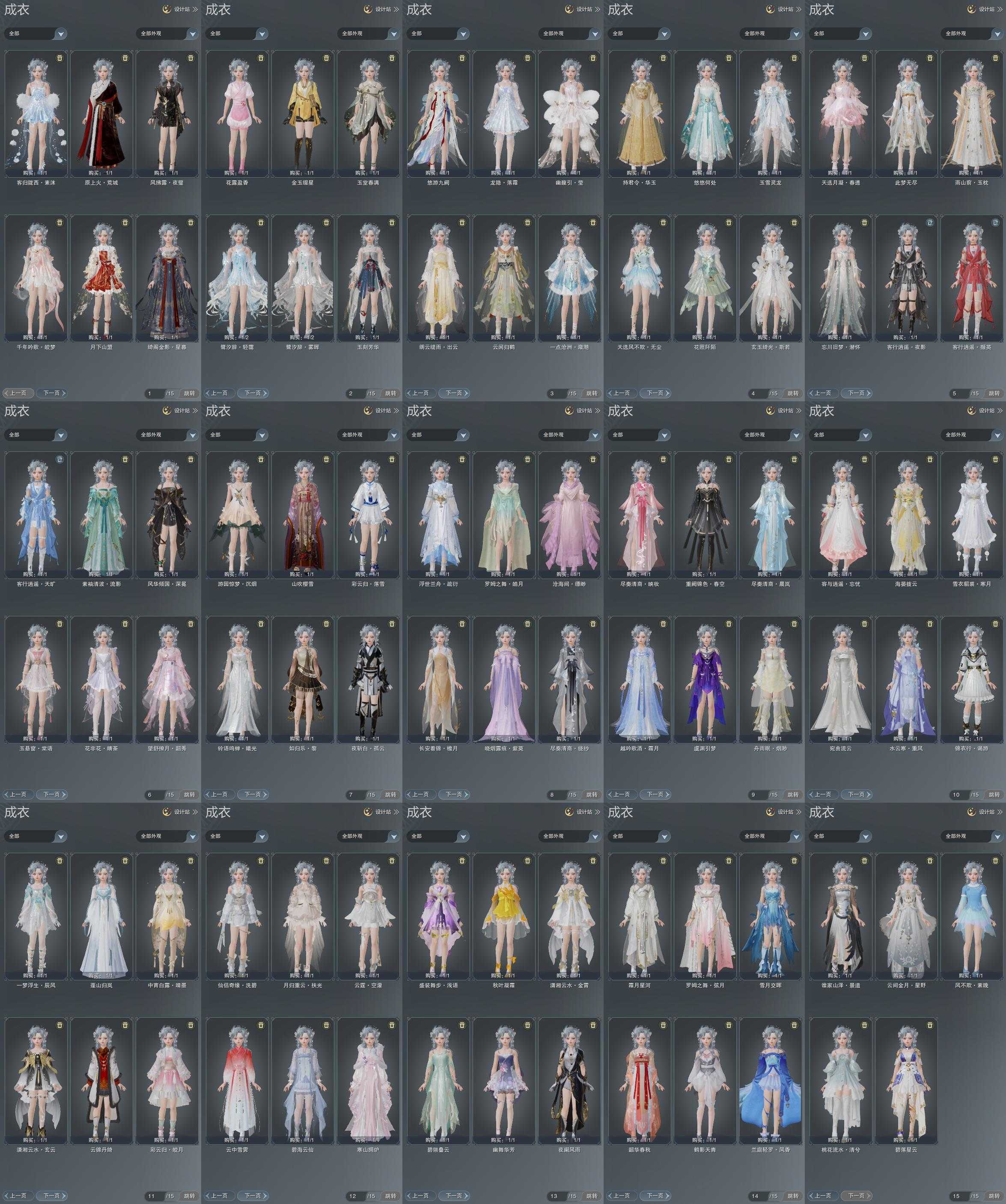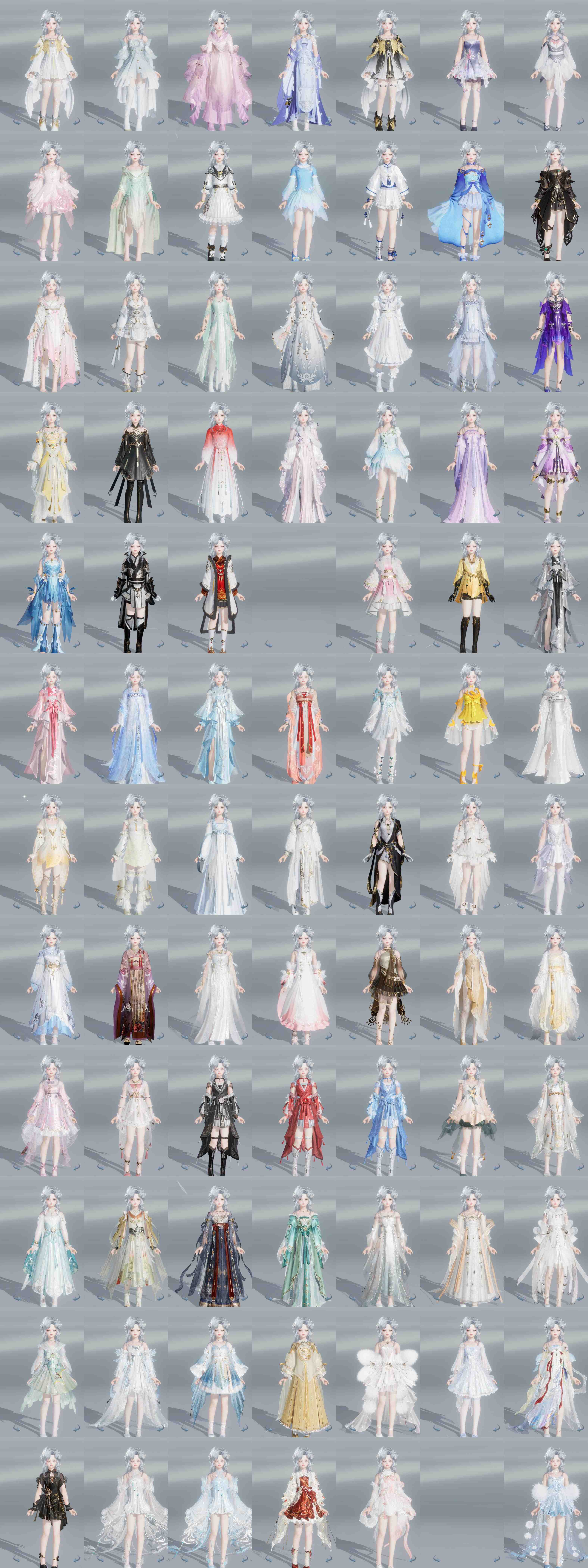 限时限量:[水云寒重风, 打歌服, 兰庭凤香, 雪衣寒月, 紫舞步, 中宵靖墨, 容与忘忧, 黄长安, 玉悬窗棠语, 客行逍遥夜影, 客行逍遥撷英, 客行逍遥天旷, 十三周年成衣, 十四周年工作服, 云闲归鹤, 蓝绮阁]