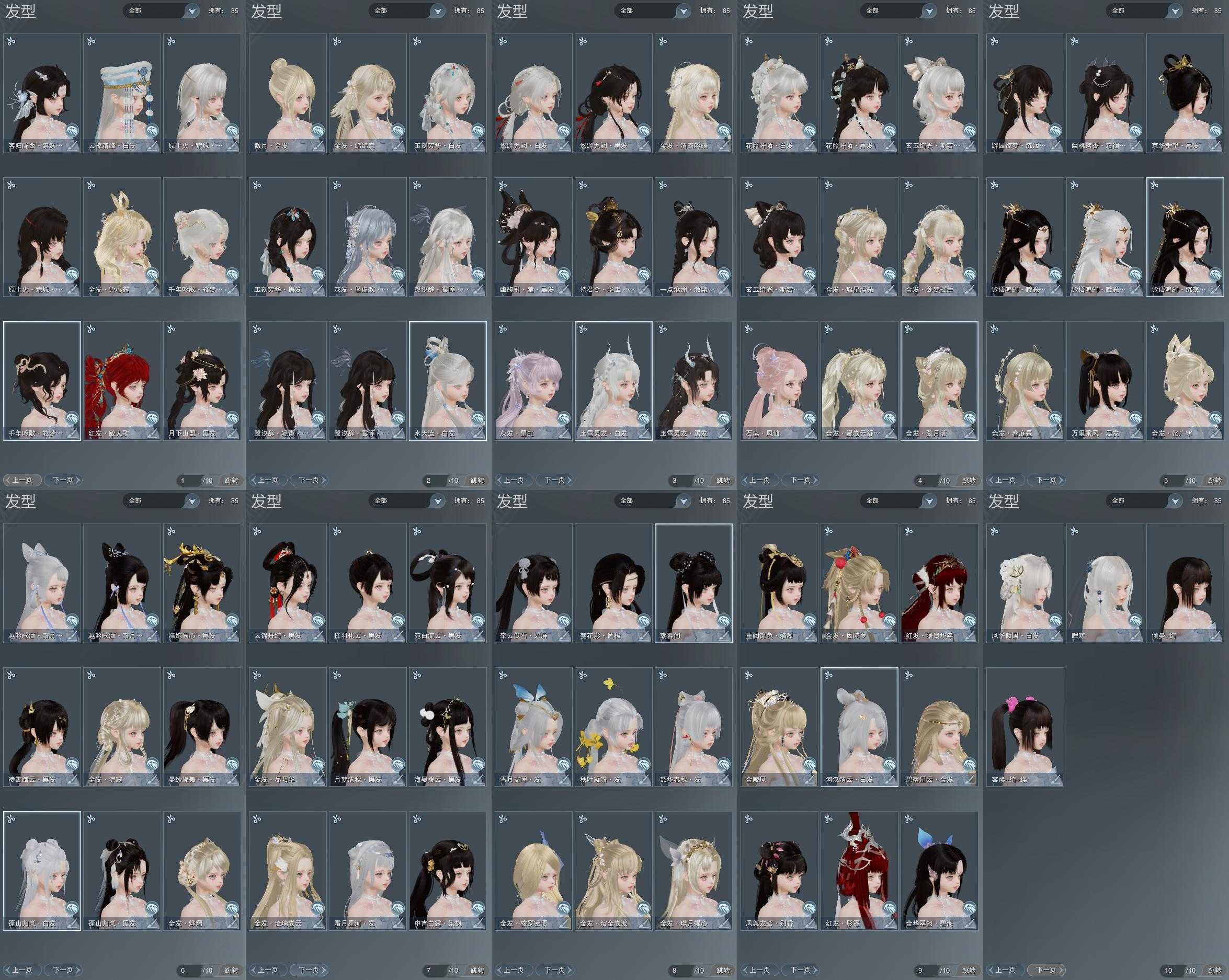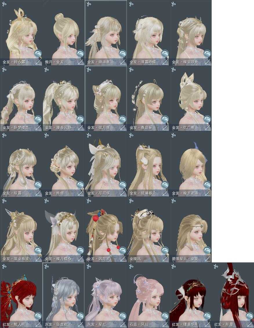 【发型】金发20个[一代金, 狐金, 猴金, 兔金, 资历金, 鼠金, 中秋金, 蝶金, 苏金, 龙女金, 猪金, 珊瑚金, 巴卡金, 云金, 女仆金, 雪金, 水母金, 咩金, 铃金, 傲月金发], 红发6个[凤仙粉, 羊红, 猴红, 十五红, 二代灰, 三代灰银], 黑发37个, 白发20个, 盒子发型[二代花朝黑, 丝路黑, 狄仁杰黑, 二代七夕白, 一代重阳白, 踏云黑发, 四代七夕黑发, 四代中秋蓝黑发, 白端午白发, 乘风黑发, 雪月白发, 白楼兰黑发, 黑楼兰黑发, 二代花朝白, 四代中秋蓝白发, 白楼兰白发, 紫幽香黑发, 新绿游园黑, 白玄玉黑发, 白雪人白发, 踏青黑发, 灵龙盒黑发, 蓝沧洲盒黑发, 踏青白发, 白持君盒黑发, 灵龙白发, 白幽馥黑发, 游龙盒黑发, 游龙盒白发, 白鹭黑发, 蓝鹭黑发, 九七黑发, 白鹭白发, 白蛇盒黑发, 黑上火黑发, 白蛇盒白发, 黑上火白发, 蓝陇西黑发, 云掠霜峰白发], 总页数10