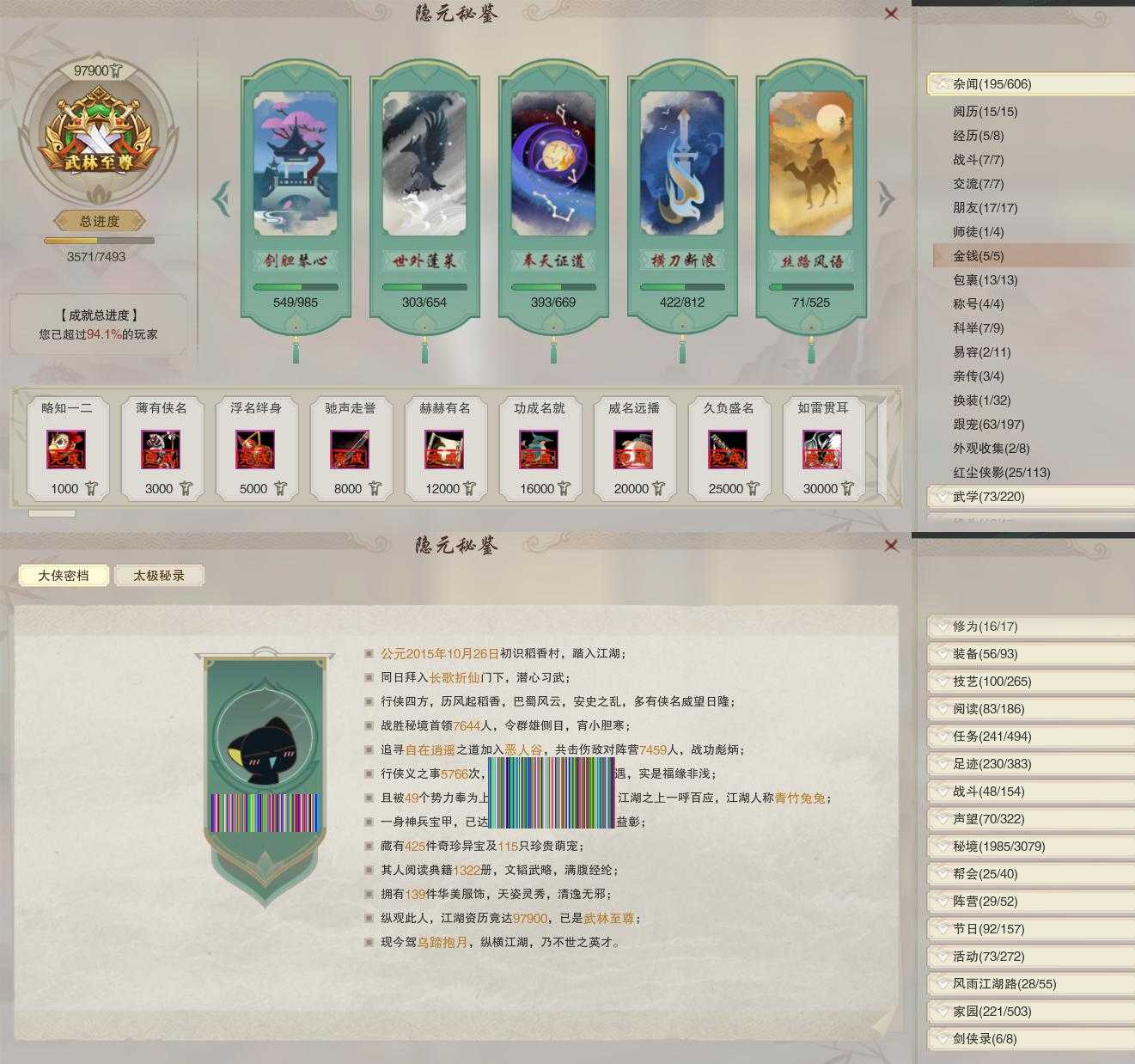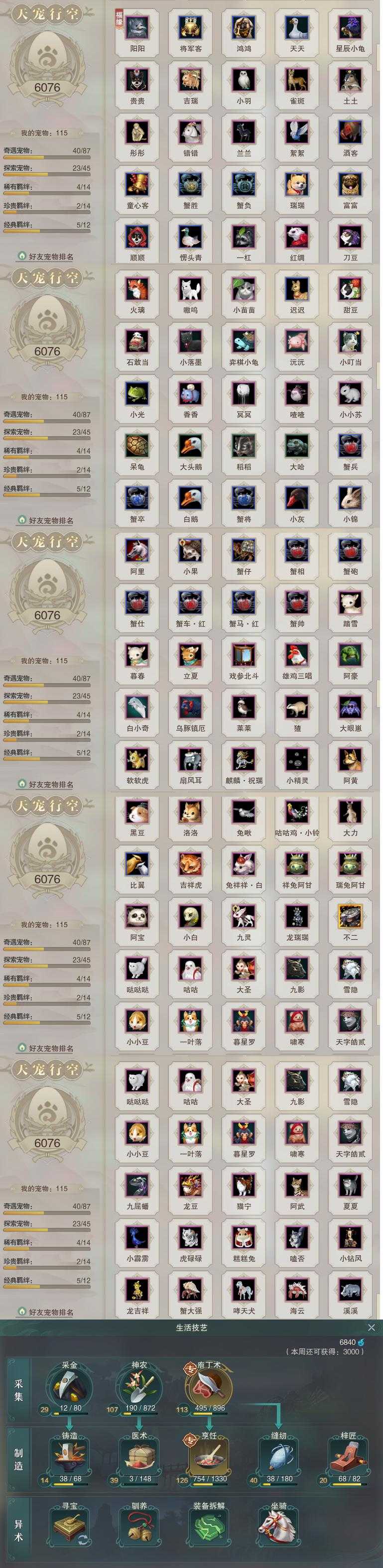 【同伴】沈剑心76级境界贰,月嘉禾74级境界壹,沐晴柔73级境界壹,年小鹿73级境界壹,温折枝72级境界壹,茸茸69级境界壹,燕子娘65级境界壹,阮归云59级境界壹,温辞秋1级境界壹,年小熊1级境界壹,阮闲舟1级境界壹