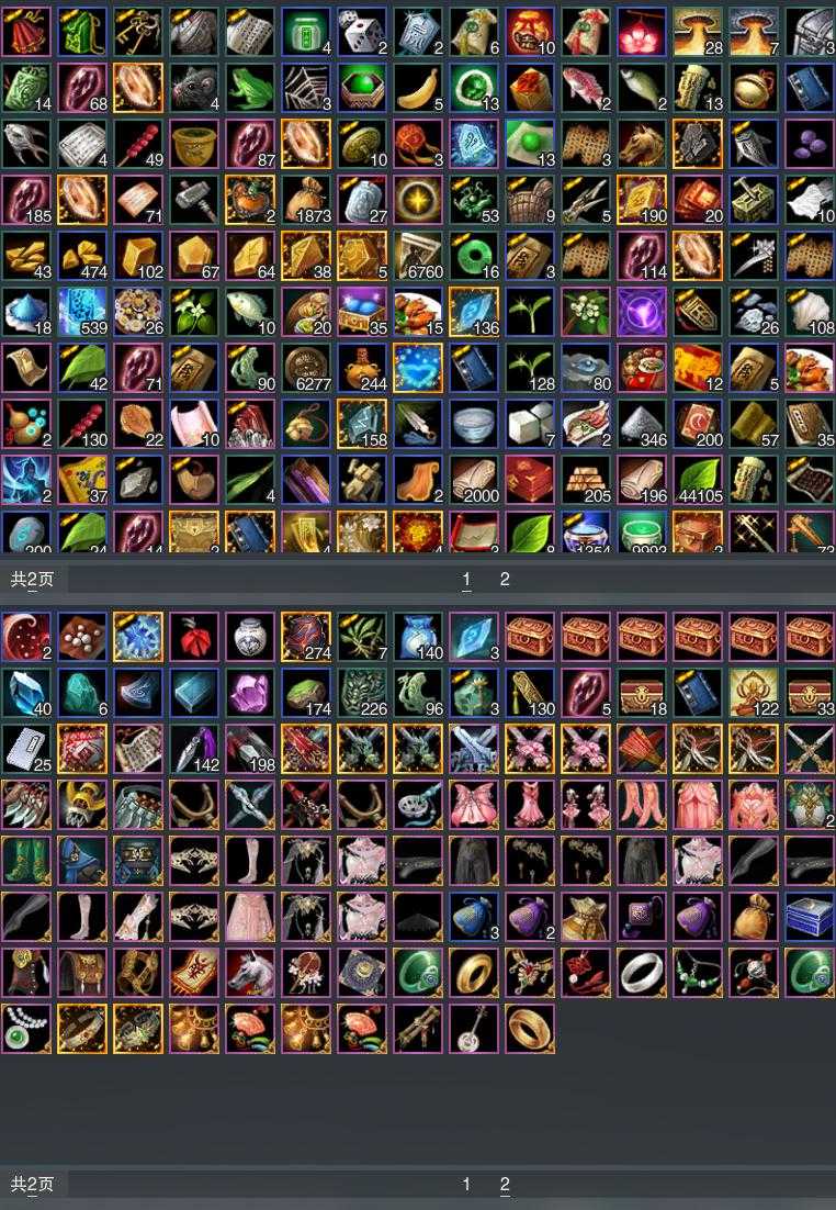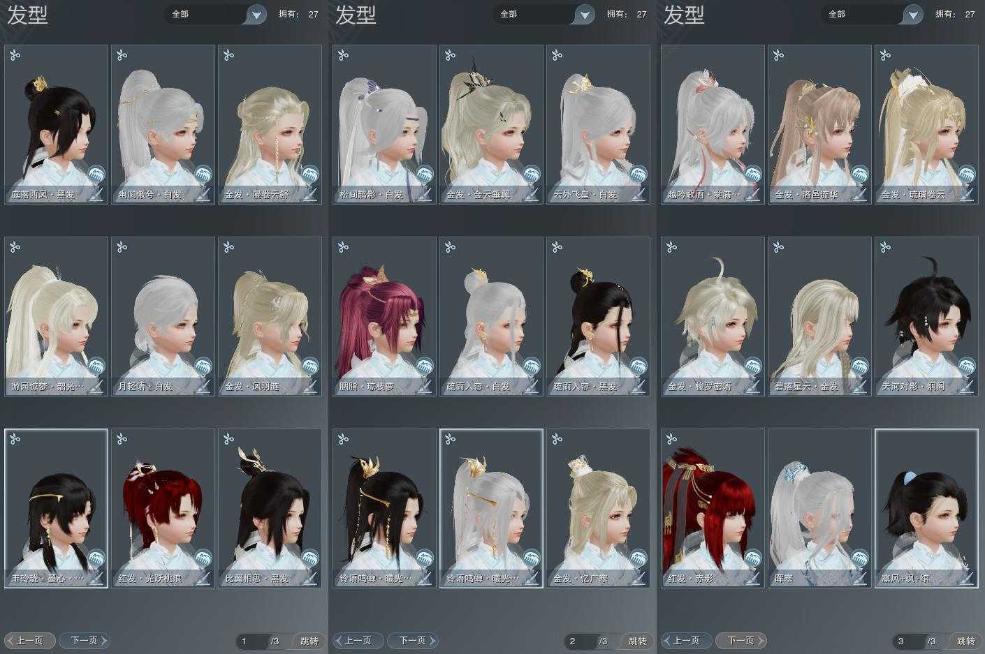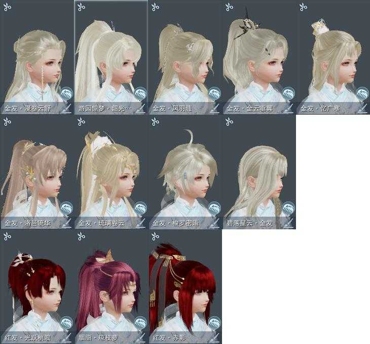 【发型】金发9个[兔金, 资历金, 苏金, 龙女金, 玫瑰金, 苍金, 凤金, 云金, 白游园金发], 红发3个[五红, 十一红, 紫发], 黑发6个, 白发8个, 盒子发型[白楼兰黑发, 澡盒黑发, 四代中秋粉白发, 五代七夕黑发, 白楼兰白发, 墨心黑发, 澡盒白发, 飞皇白发, 同人白发, 月轻语白发, 幽涧愀兮白发], 总页数3