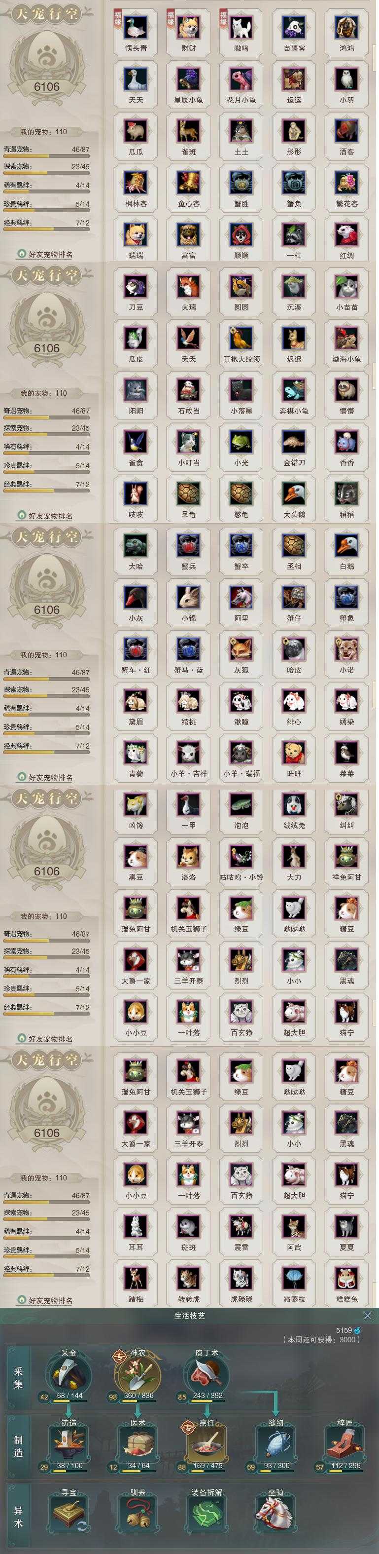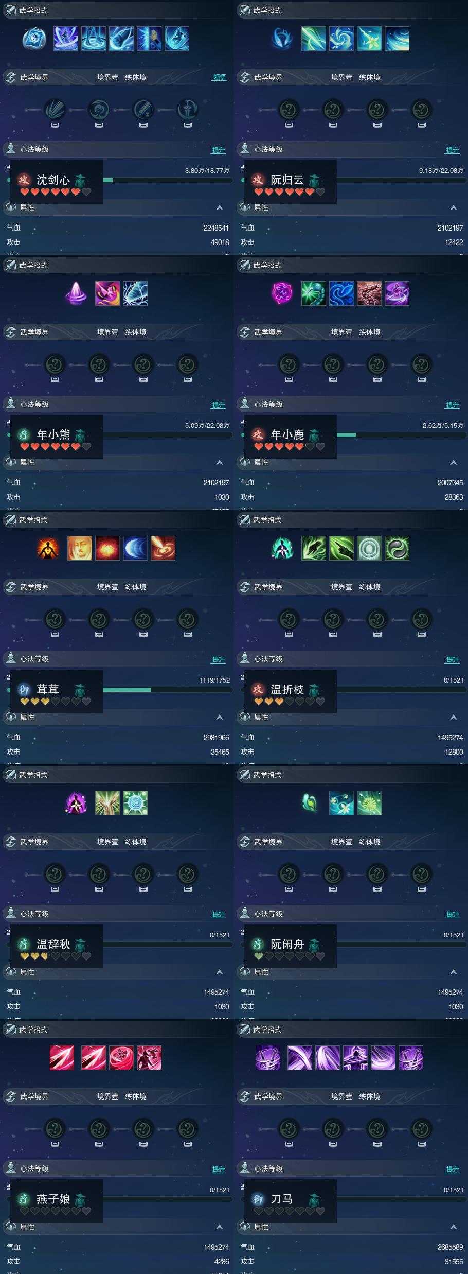 【同伴】沈剑心73级境界壹,阮归云73级境界壹,年小熊73级境界壹,年小鹿62级境界壹,茸茸22级境界壹,温折枝1级境界壹,温辞秋1级境界壹,阮闲舟1级境界壹,燕子娘1级境界壹,刀马1级境界壹