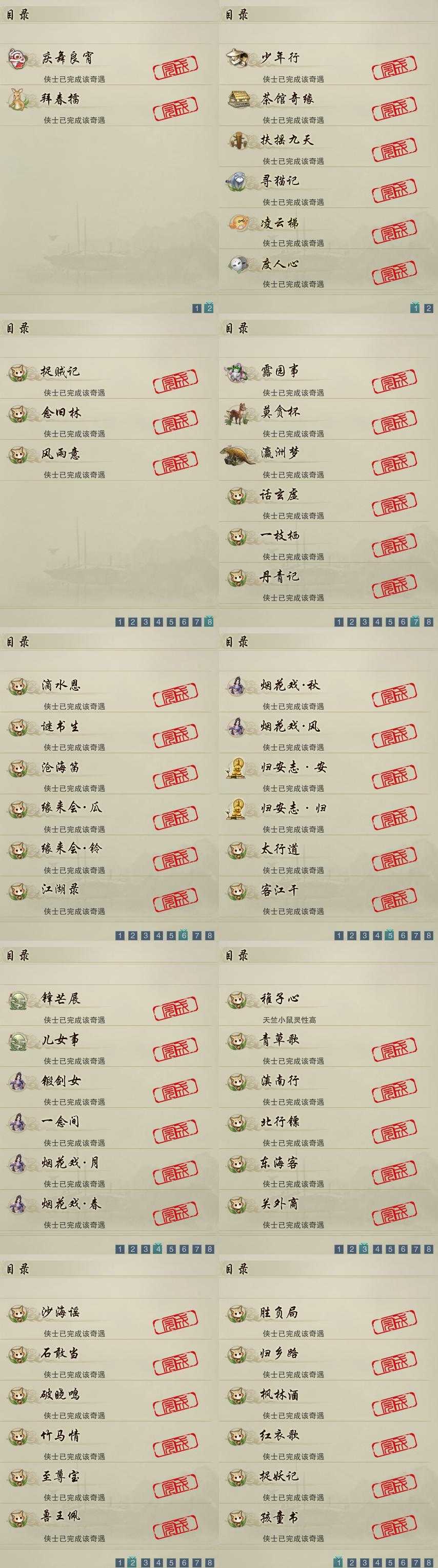 【奇遇】8个[少年行, 扶摇九天, 茶馆奇缘, 寻猫记, 庆舞良宵, 凌云梯, 度人心, 拜春擂]