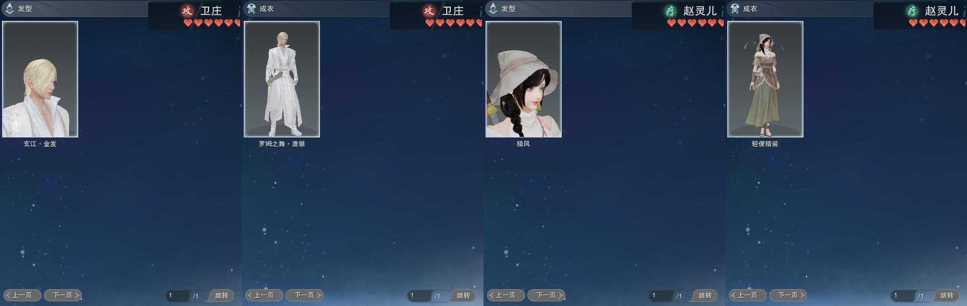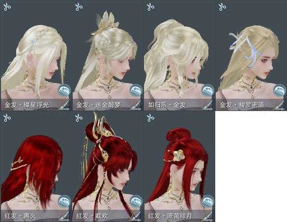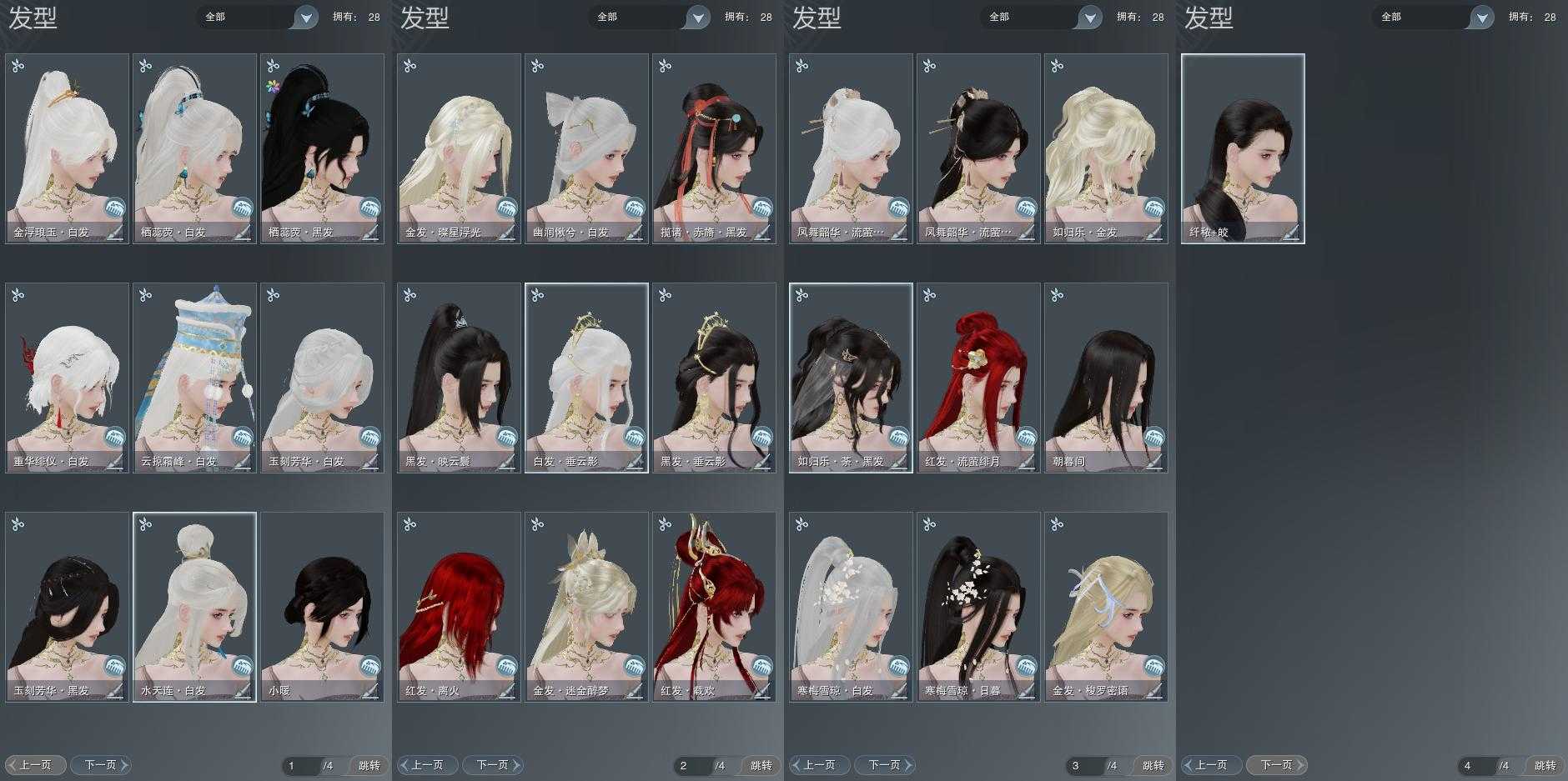 【发型】金发5个[资历金, 如归金, 牛金, 雪金, 玄江金发], 红发3个[牛红, 小资历红, 大资历红], 黑发10个, 白发10个, 盒子发型[流萤黑发, 流萤白发, 红懒猪黑发, 幽涧愀兮白发, 云掠霜峰白发], 总页数4