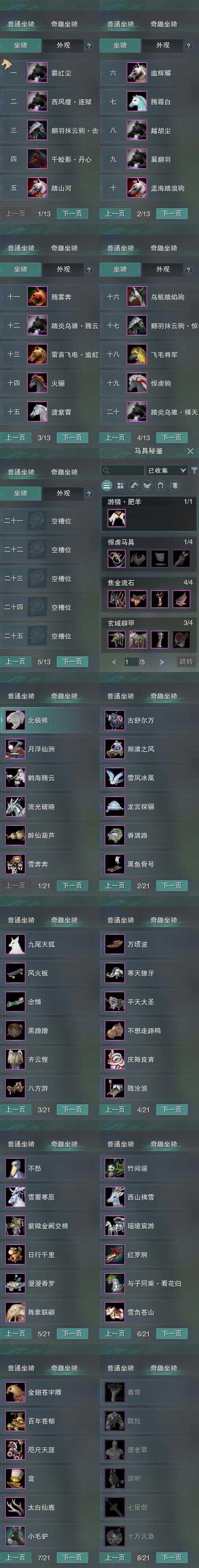 【坐骑】20个[踏炎横天, 踏炎腾云, 西风瘦逐狱, 飞毛将军, 翻羽抹云驹击云, 翻羽抹云驹惊华, 千蛟影丹心, 霸红尘, 雷首飞电逾虹, 乌鬃踏焰驹]
