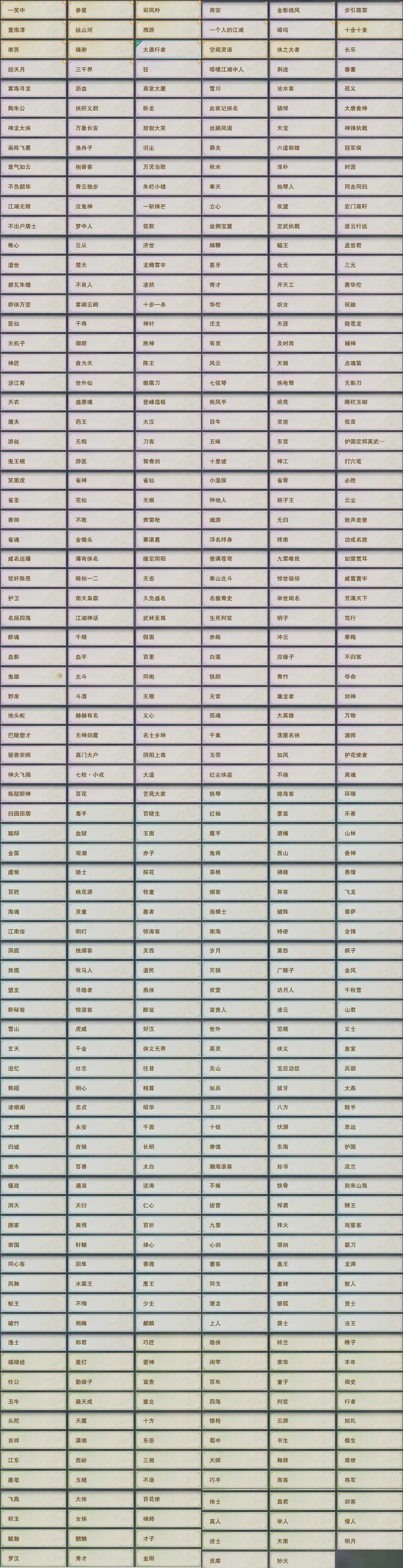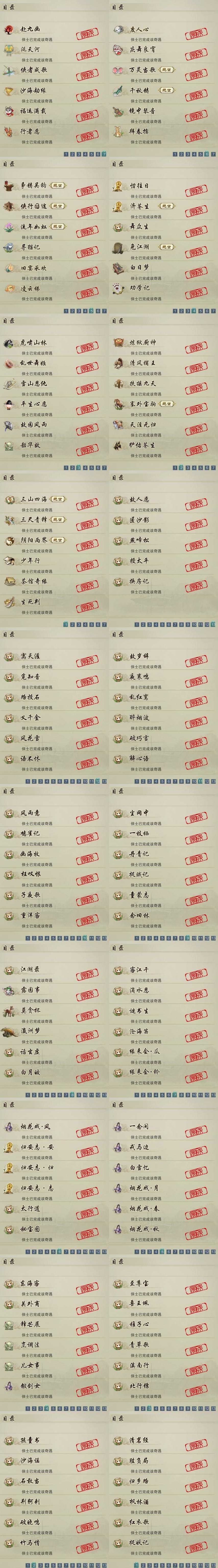 【奇遇】41个[白日梦, 天涯无归, 三山四海, 劝学记, 雪山恩仇, 阴阳两界, 兔江湖, 平生心愿, 惜往日, 乱世舞姬, 塞外宝驹, 争铸吴钩, 虎啸山林, 韶华故, 济苍生, 护佑苍生, 少年行, 故园风雨, 扶摇九天, 三尺青锋, 流年如虹, 舞众生, 清风捕王, 侠行囧途, 寻猫记, 茶馆奇缘, 庆舞良宵, 万灵当歌, 生死判, 千秋铸]