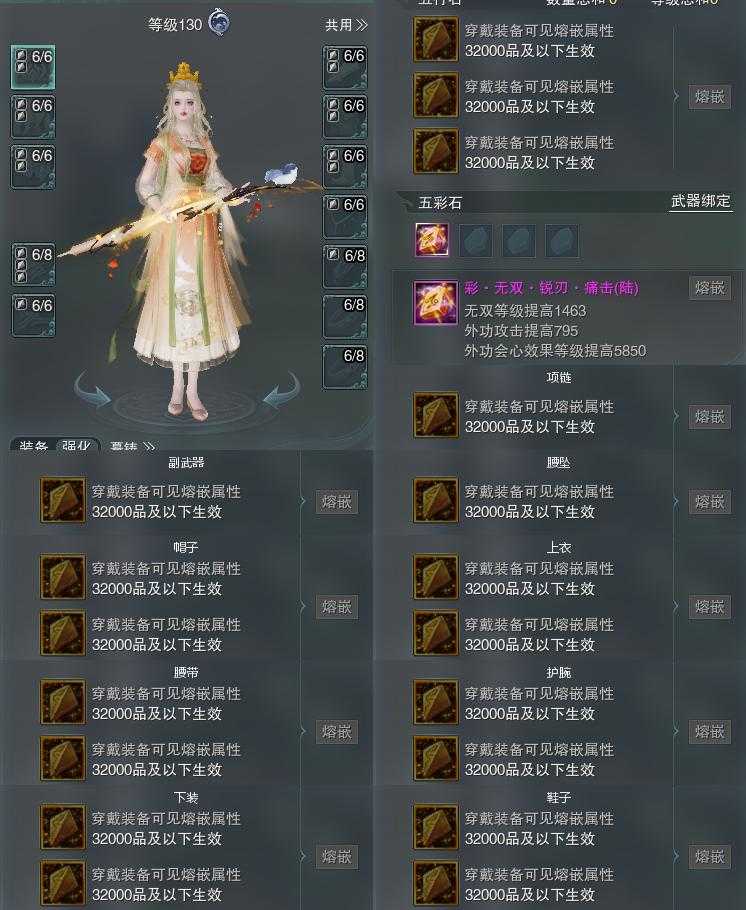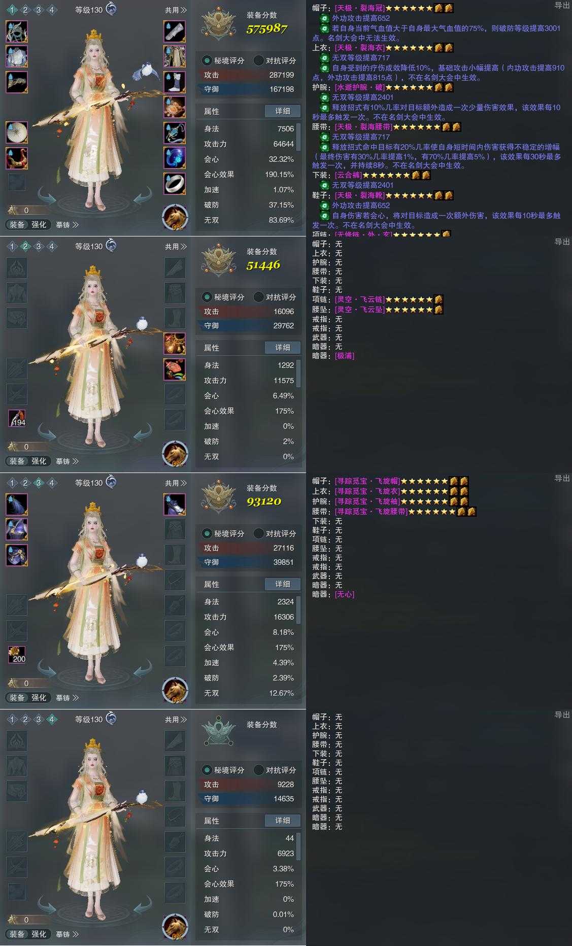 【装备】130级,凌海诀PVE575987,装备二51446,装备三93120,装备四0