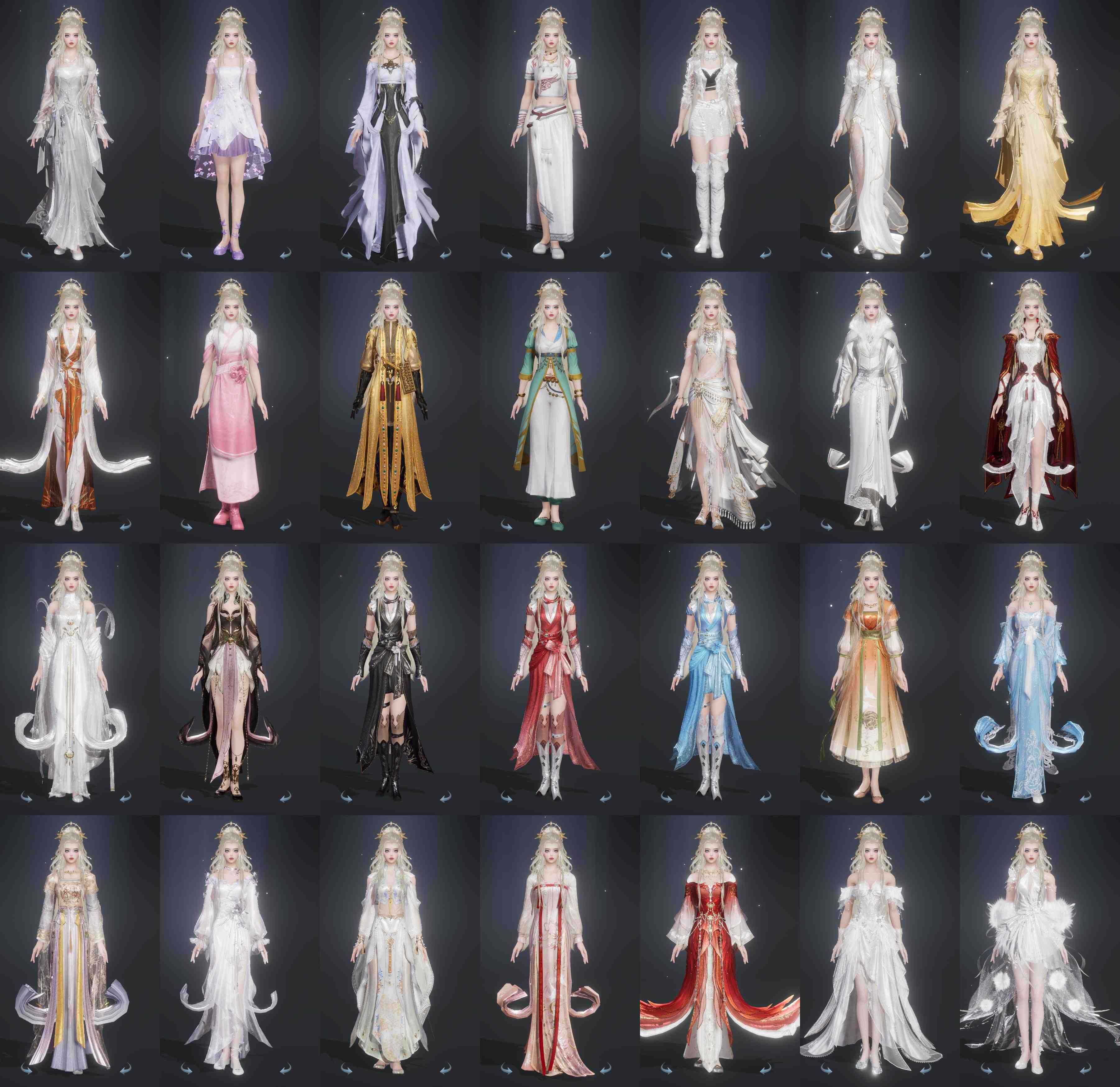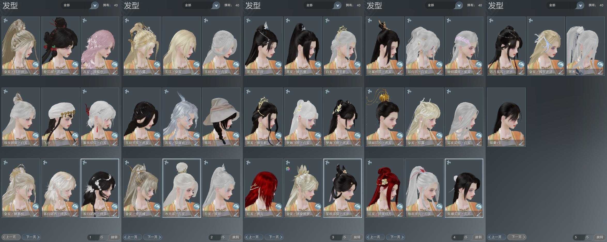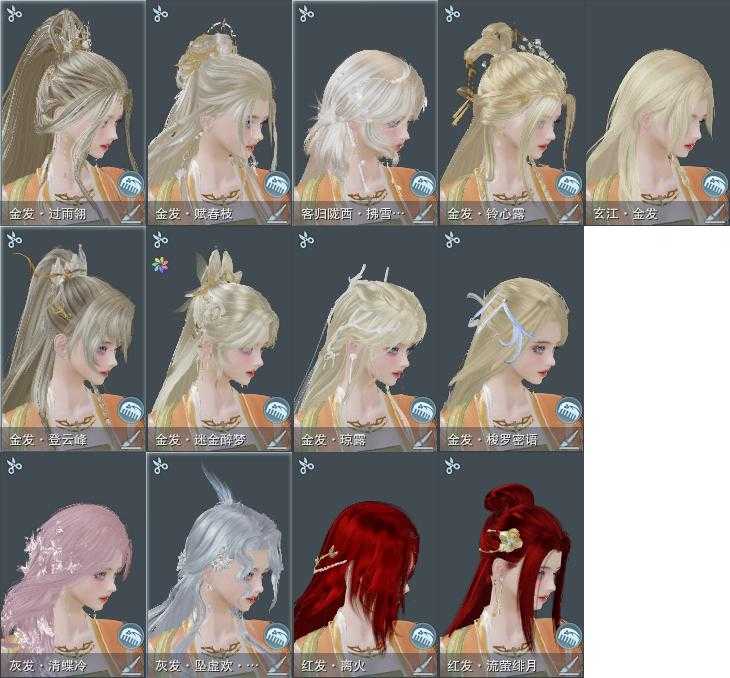 【发型】金发9个[资历金, 珊瑚金, 牛金, 三代金, 铃金, 玄江金发, 蛇金, 翎金, 白陇西金发], 红发4个[蝶粉, 小资历红, 大资历红, 三代灰银], 黑发14个, 白发12个, 盒子发型[四代七夕黑发, 紫盒白发, 五代七夕黑发, 如归白发, 唐风玉壶黑发, 小熊黑发, 小熊白发, 白陇西黑发], 总页数5
