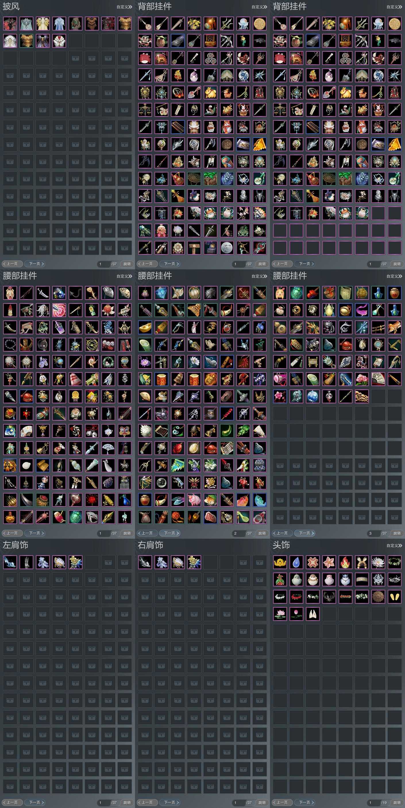 【披风】12个,[7W资历披风, 14W资历披风, 三山披风, 虎盒披风, 折枝缀雪, 空山闲雪, 云麒赫奕, 赤庭葳蕤]