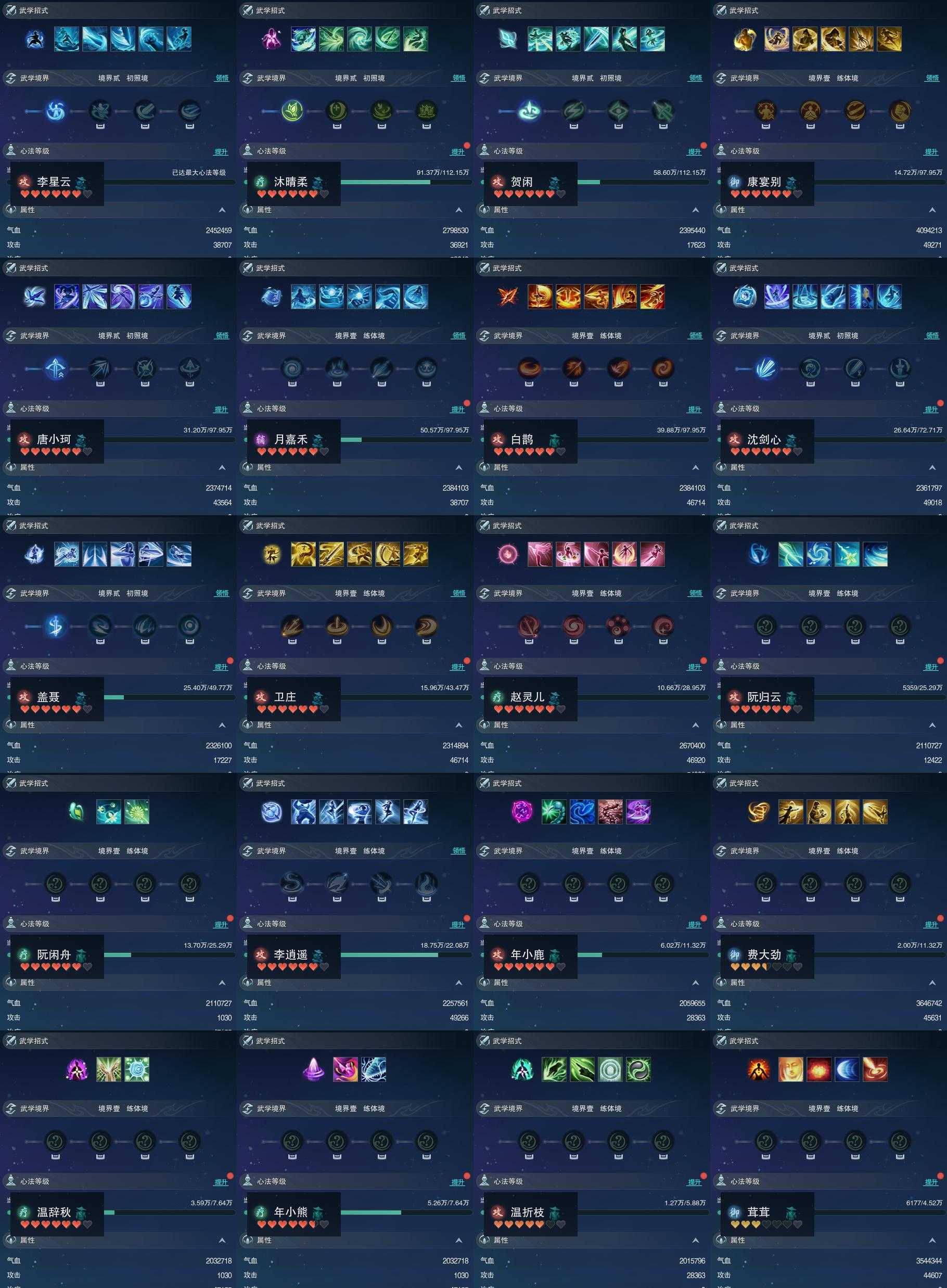 【同伴】李星云90级境界贰,沐晴柔85级境界贰,贺闲85级境界贰,康宴别84级境界壹,唐小珂84级境界贰,月嘉禾84级境界壹,白鹊84级境界壹,沈剑心83级境界贰,盖聂79级境界贰,卫庄78级境界壹,赵灵儿75级境界壹,阮归云74级境界壹,阮闲舟74级境界壹,李逍遥73级境界壹,年小鹿68级境界壹,费大劲68级境界壹,温辞秋65级境界壹,年小熊65级境界壹,温折枝63级境界壹,茸茸61级境界壹