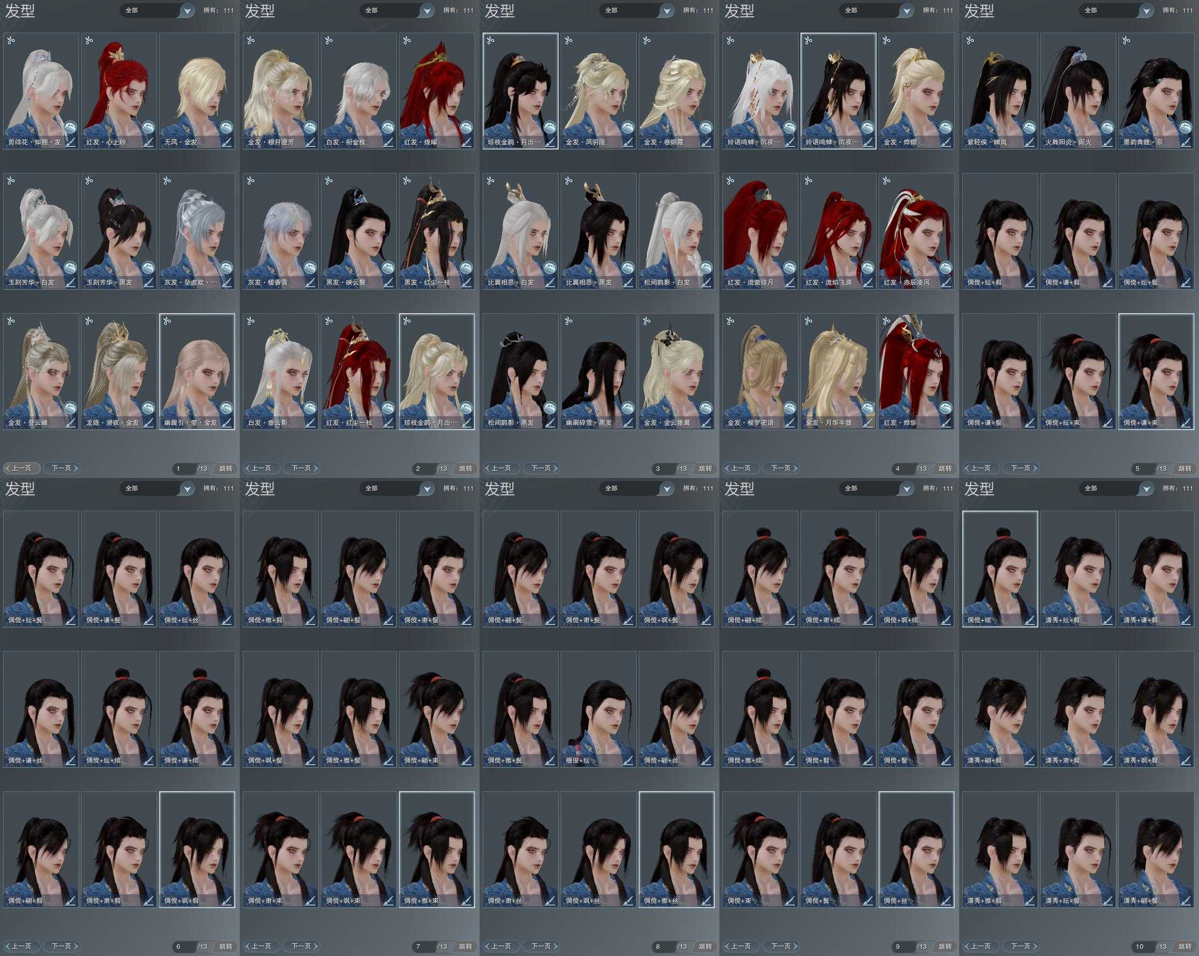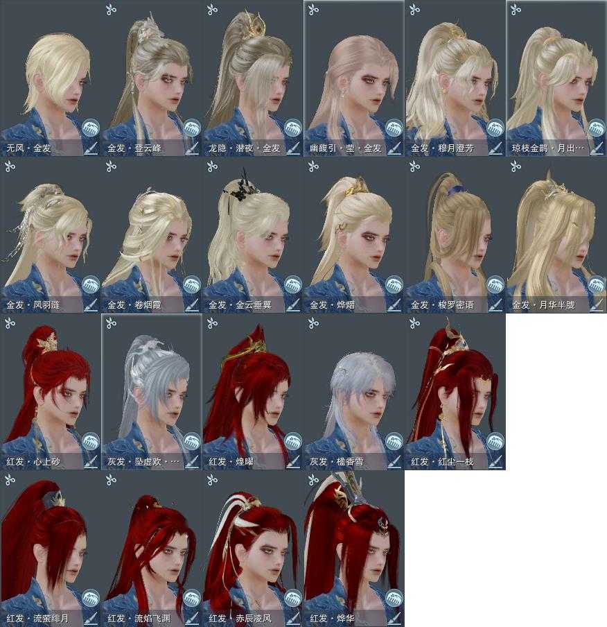 【发型】金发12个[资历金, 鸡金, 猪金, 苍金, 角金, 凤金, 穆金, 三代金, 无风金发, 澄琼枝金发, 白幽馥金发, 黑龙隐金发], 红发9个[七红, 八红, 九红, 十二红, 兔红, 小资历红, 蛇红, 一代灰, 三代灰银], 黑发11个, 白发7个, 盒子发型[黑楼兰黑发, 幽阑黑发, 同人黑发, 五代七夕黑发, 黑楼兰白发, 同人白发, 五代七夕白发, 澄琼枝黑发, 十二黑], 总页数10