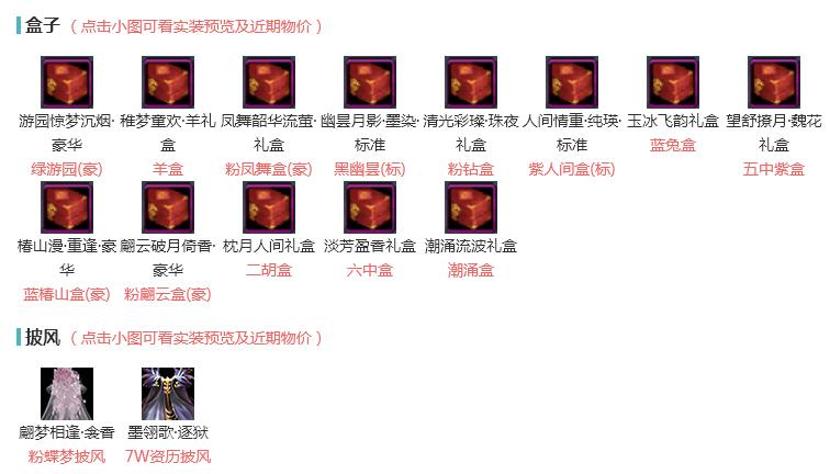 盒子:[粉翩云盒(豪), 粉凤舞盒(豪)(缺发型), 五中紫盒, 绿游园(豪), 六中盒, 二胡盒, 羊盒, 紫人间盒(标), 粉钻盒, 蓝兔盒, 黑幽昙(标), 蓝椿山盒(豪), 潮涌盒]