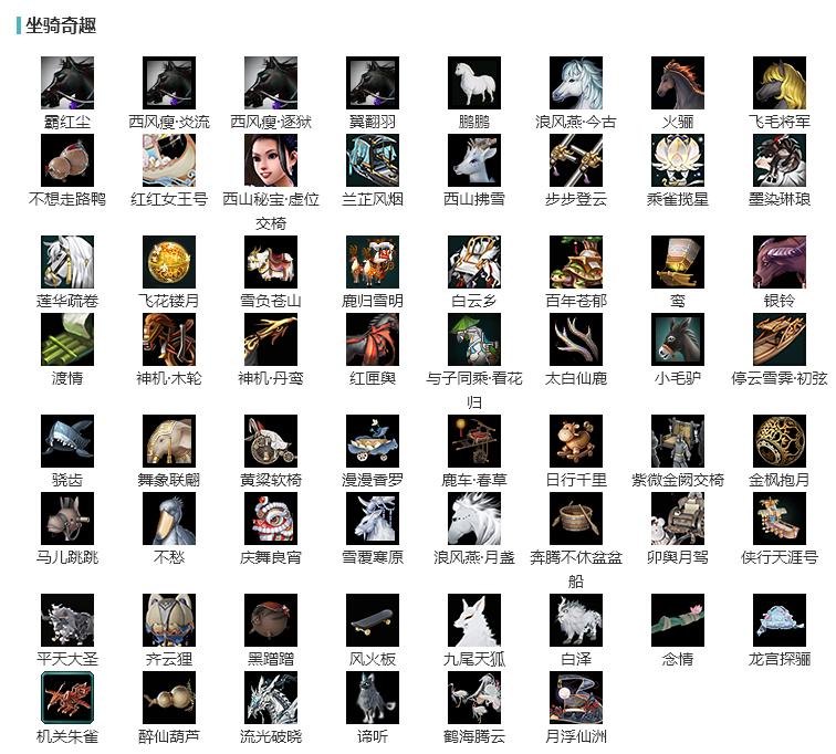 【坐骑】6个[西风瘦炎流, 西风瘦逐狱, 飞毛将军, 鹏鹏, 浪风燕今古, 霸红尘]