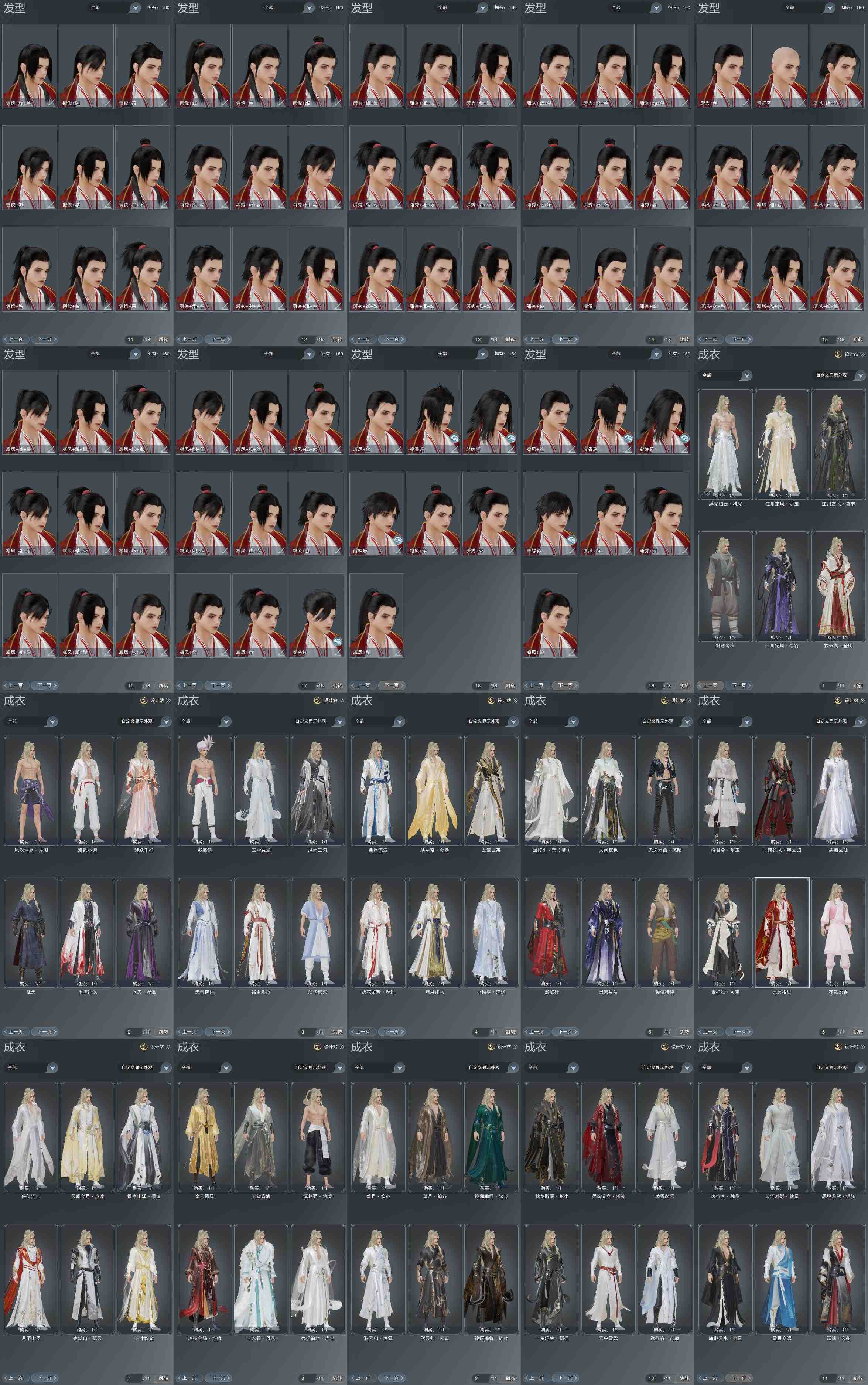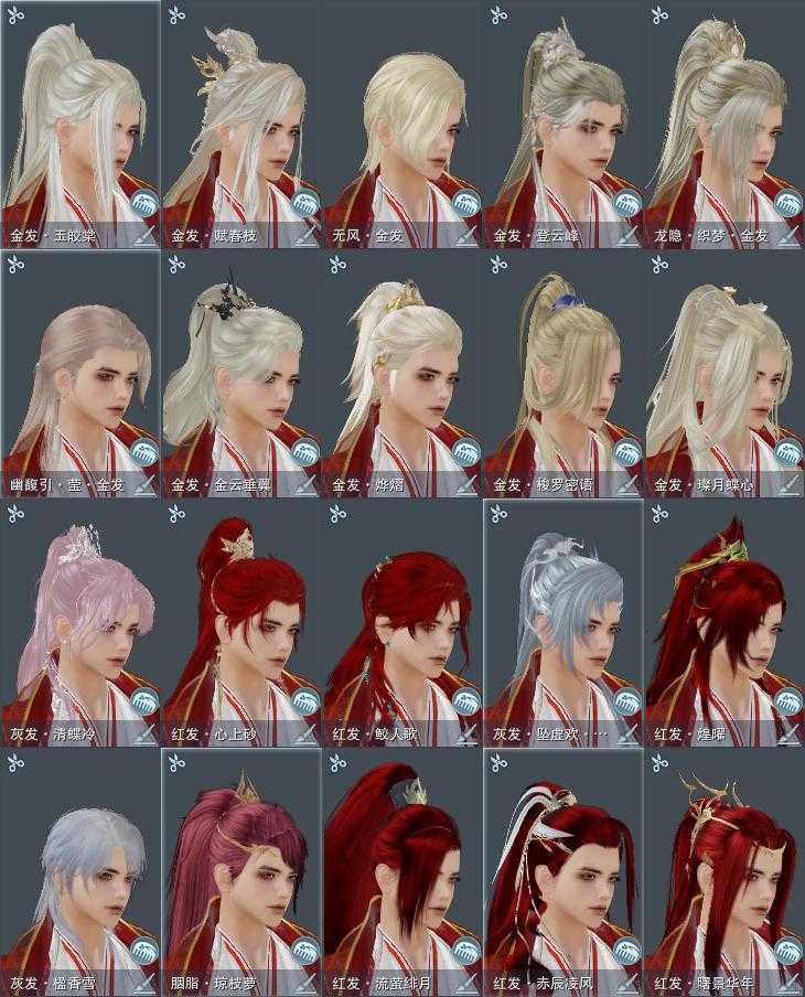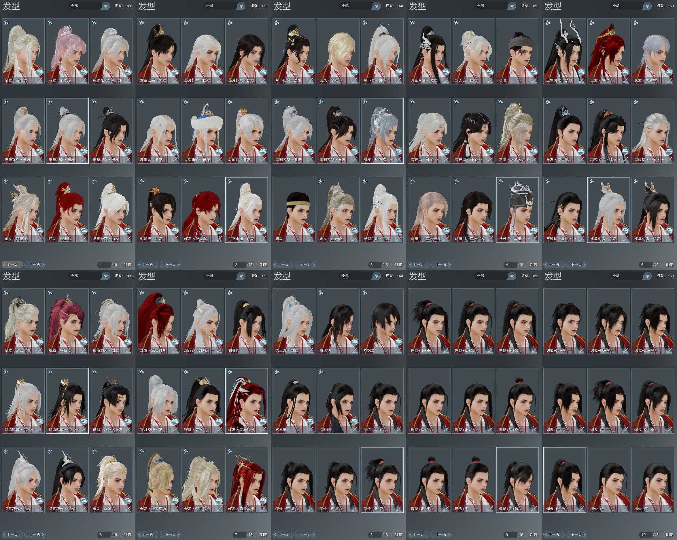 【发型】金发10个[狐金, 资历金, 猪金, 苍金, 三代金, 无风金发, 蛇金, 七中金发, 白幽馥金发, 白龙隐金发], 红发10个[八红, 紫发, 蝶粉, 猴红, 兔红, 小资历红, 十五红, 蛇红, 一代灰, 三代灰银], 黑发27个, 白发21个, 盒子发型[踏云黑发, 黑谪仙黑发, 雪月白发, 黑楼兰黑发, 踏云白发, 五代七夕黑发, 墨心黑发, 黑楼兰白发, 五代七夕白发, 墨心白发, 红琼枝黑发, 灵龙盒黑发, 白持君盒黑发, 白幽馥黑发, 黑藏袍黑发, 黑藏袍白发, 茄盒黑发, 茄盒白发, 九七黑发, 镰刀黑发, 黑月下白发, 九七白发, 镰刀白发, 燕月盒黑发, 墨龙盒黑发, 云掠霜峰白发, 燕月盒白发, 墨龙盒白发], 总页数10