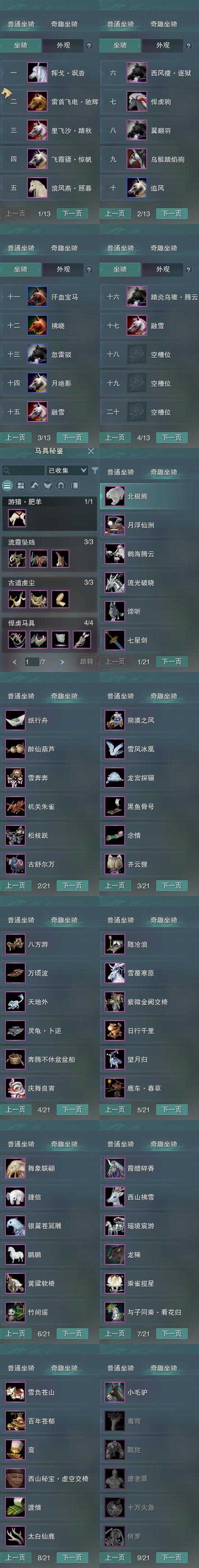 【坐骑】17个[踏炎腾云, 西风瘦逐狱, 飞霞骠惊帆, 里飞沙踏秋, 挥戈飒沓, 雷首飞电驰辉, 乌鬃踏焰驹]