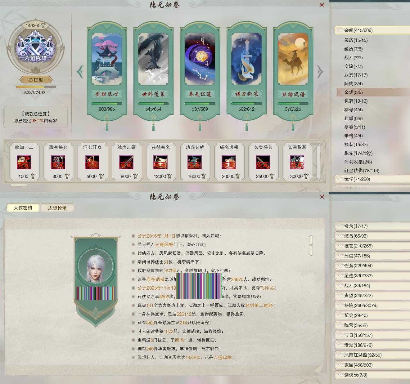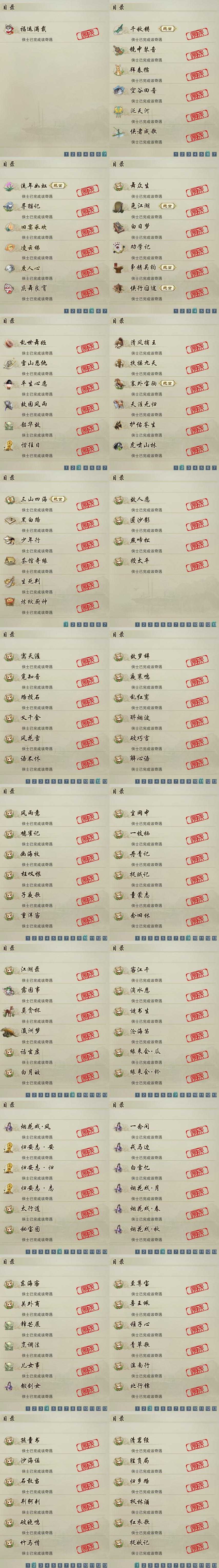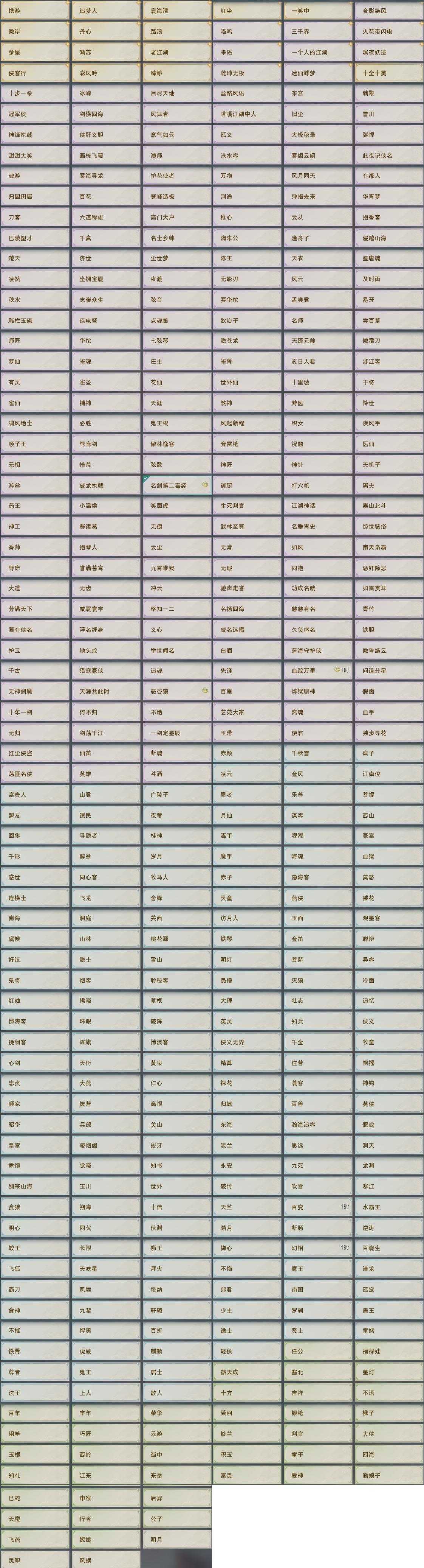 【奇遇】37个[白日梦, 天涯无归, 三山四海, 劝学记, 雪山恩仇, 兔江湖, 平生心愿, 黑白路, 乱世舞姬, 惜往日, 塞外宝驹, 争铸吴钩, 韶华故, 虎啸山林, 护佑苍生, 少年行, 故园风雨, 扶摇九天, 流年如虹, 舞众生, 清风捕王, 寻猫记, 侠行囧途, 茶馆奇缘, 庆舞良宵, 生死判, 千秋铸, 凌云梯, 炼狱厨神, 度人心]