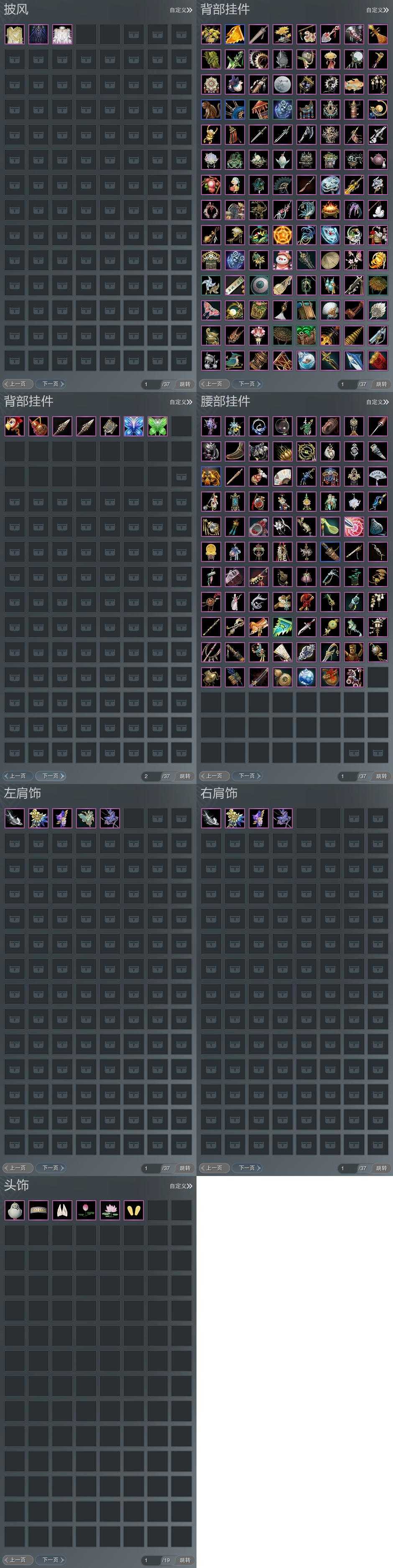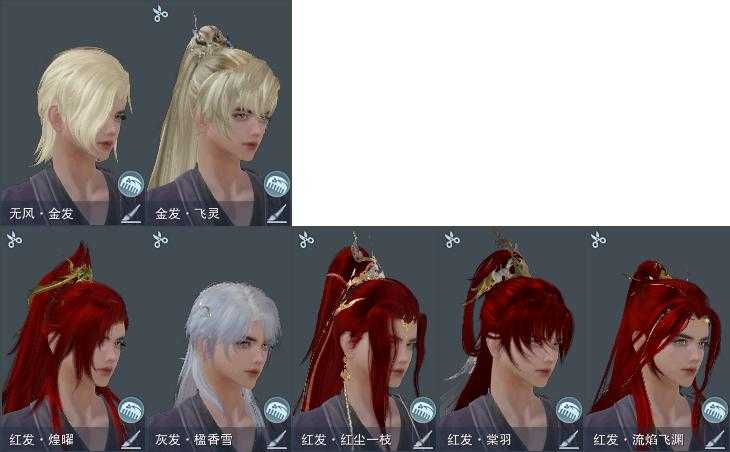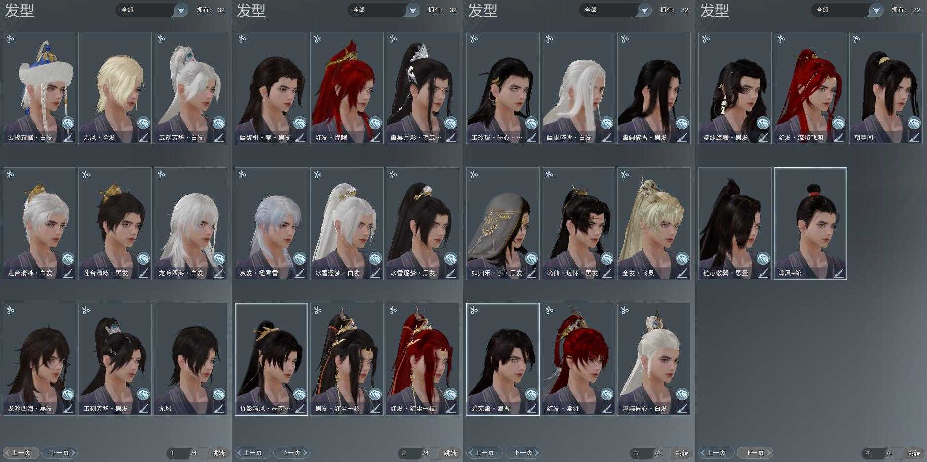 【发型】金发2个[飒金, 无风金发], 红发5个[九红, 十红, 十二红, 兔红, 一代灰], 黑发16个, 白发7个, 盒子发型[丝路黑, 黑谪仙黑发, 四代七夕白发, 幽阑黑发, 墨心黑发, 幽阑白发, 十二黑, 竹影墨花黑发, 花滑黑发, 花滑白发, 白幽昙黑发, 白幽馥黑发, 龙吟盒黑发, 莲台盒黑发, 龙吟盒白发, 莲台盒白发, 云掠霜峰白发], 总页数4