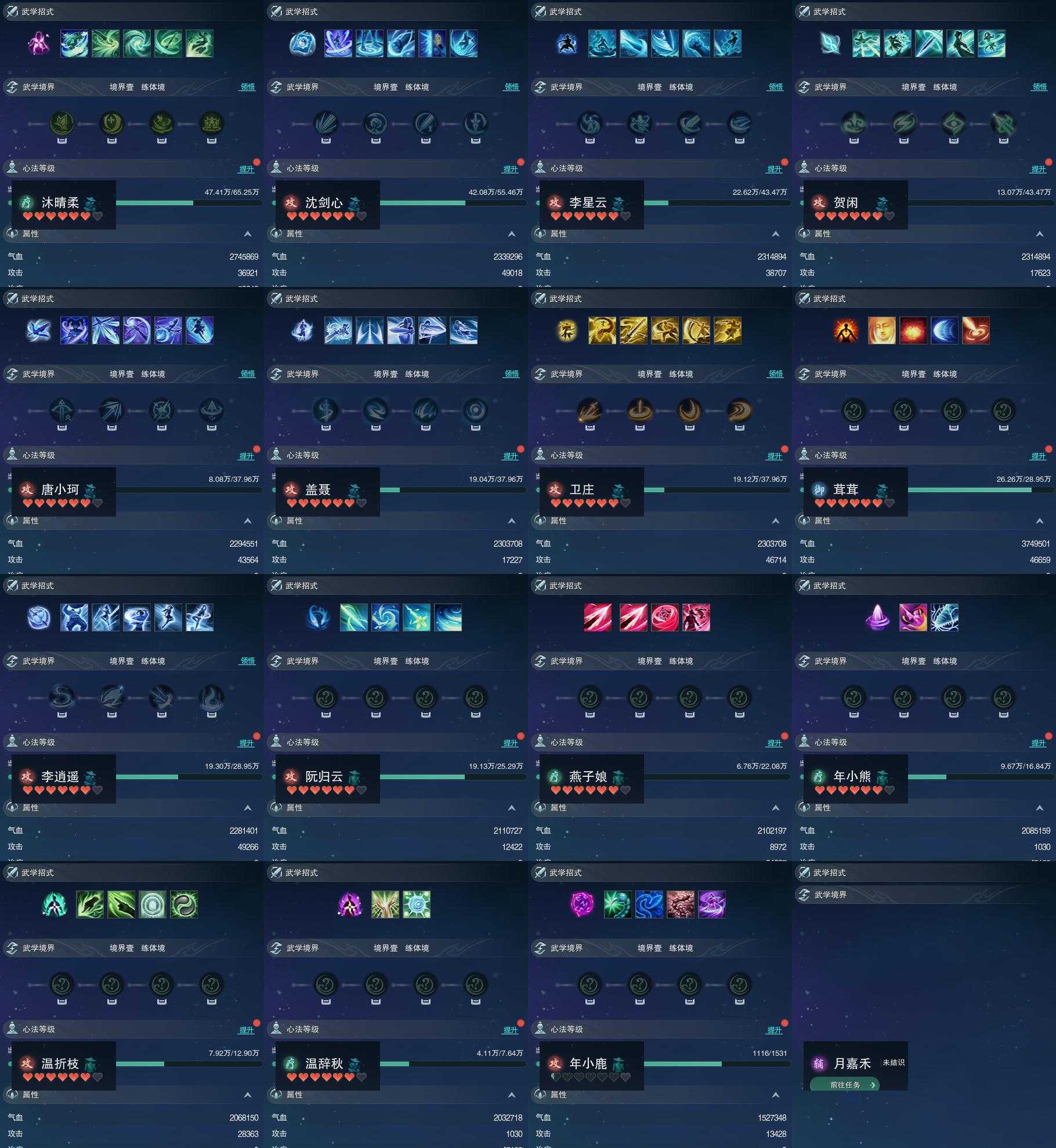 【同伴】沐晴柔81级境界壹,沈剑心81级境界壹,李星云78级境界壹,贺闲78级境界壹,唐小珂77级境界壹,盖聂77级境界壹,卫庄77级境界壹,茸茸75级境界壹,李逍遥75级境界壹,阮归云74级境界壹,燕子娘73级境界壹,年小熊71级境界壹,温折枝69级境界壹,温辞秋65级境界壹,年小鹿5级境界壹,月嘉禾级