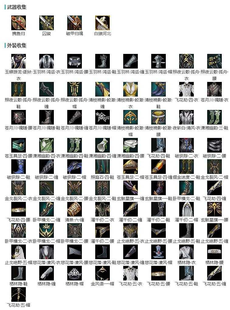 限时限量:[幽涧愀兮, 容与攸游, 水云寒雪涛, 客行逍遥天旷, 烟花套, 重天夜歌, 十二周年工作服, 重华绯仪, 海韵小调, 庭落西风, 云闲归鹤, 镜湖云遥, 红玫瑰, 白长天, 十四周年工作服, 霆螭月华, 十三周年成衣, 客行逍遥夜影, 黄长安, 绿游仙]