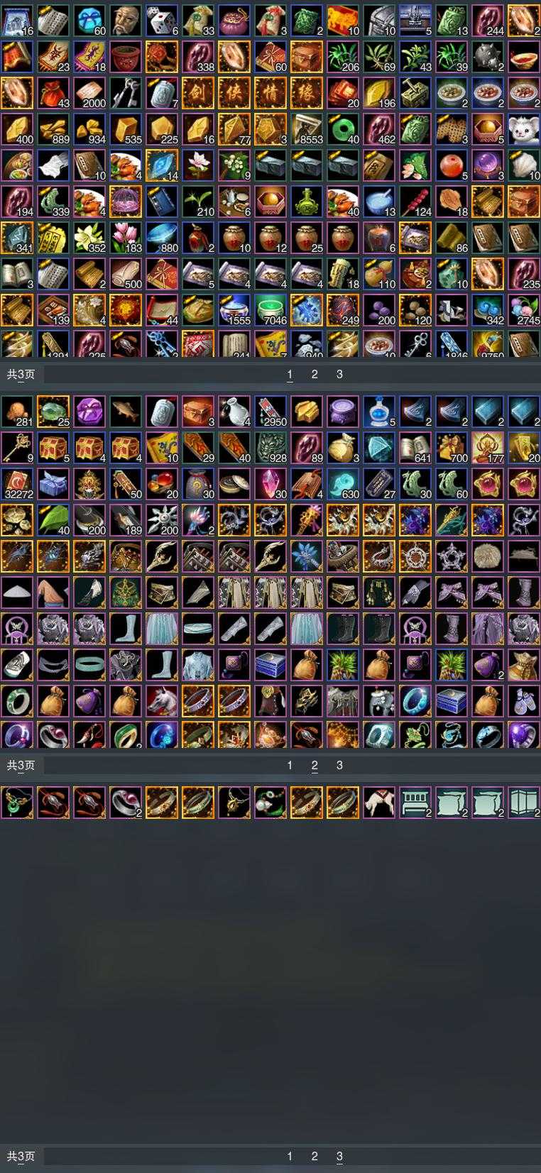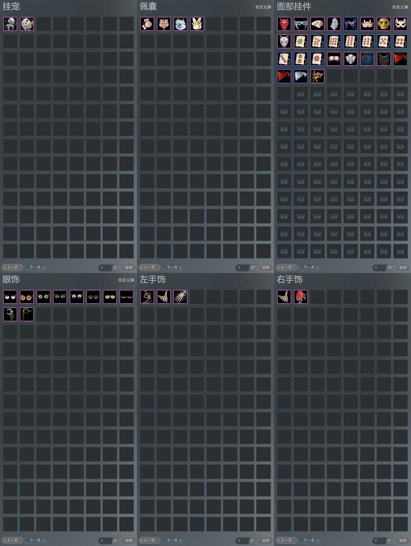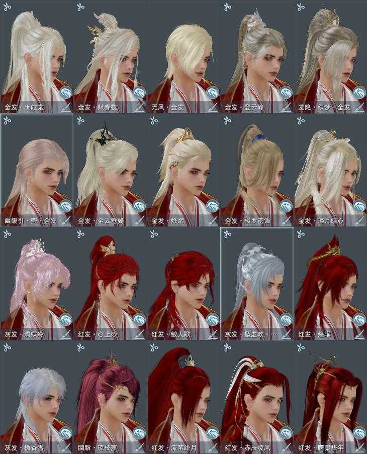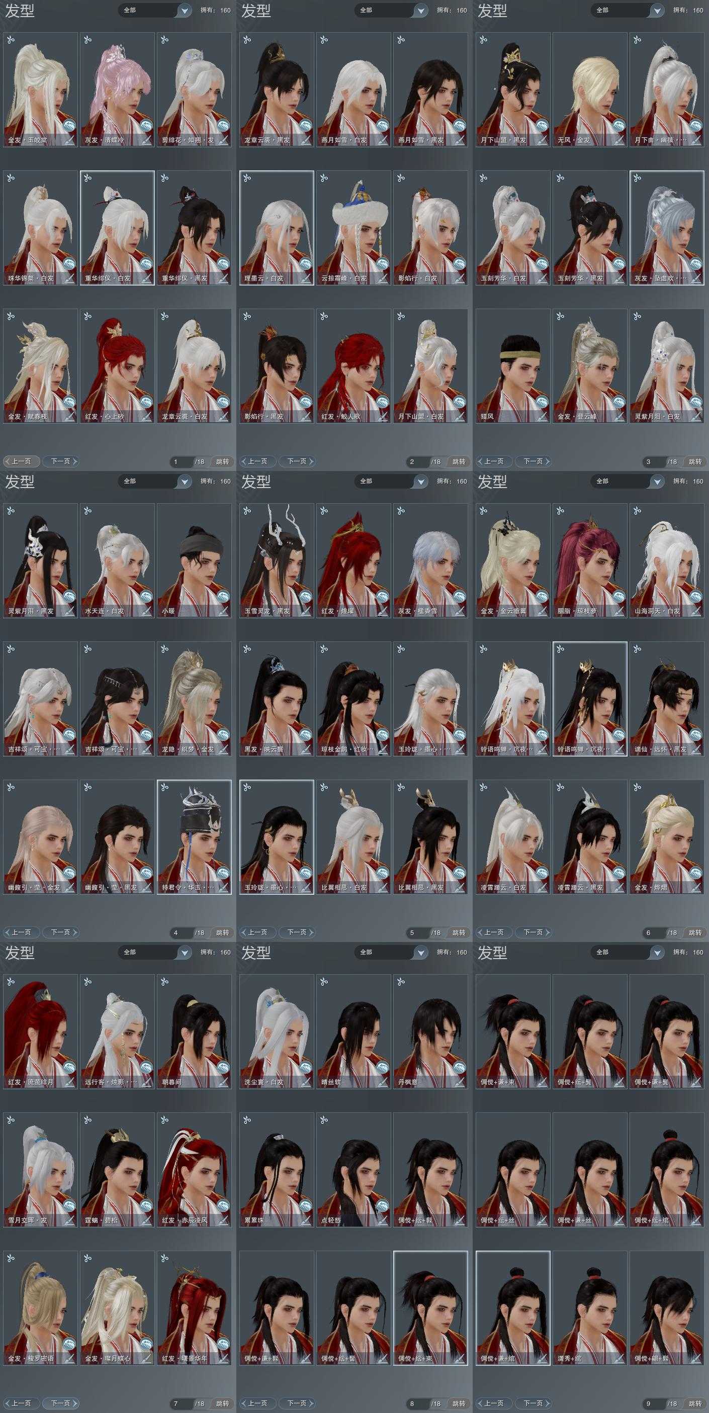 【发型】金发10个[狐金, 资历金, 猪金, 苍金, 三代金, 无风金发, 蛇金, 七中金发, 白幽馥金发, 白龙隐金发], 红发10个[八红, 紫发, 蝶粉, 猴红, 兔红, 小资历红, 十五红, 蛇红, 一代灰, 三代灰银], 黑发27个, 白发21个, 盒子发型[踏云黑发, 黑谪仙黑发, 雪月白发, 黑楼兰黑发, 踏云白发, 五代七夕黑发, 墨心黑发, 黑楼兰白发, 五代七夕白发, 墨心白发, 红琼枝黑发, 灵龙盒黑发, 白持君盒黑发, 白幽馥黑发, 黑藏袍黑发, 黑藏袍白发, 茄盒黑发, 茄盒白发, 九七黑发, 镰刀黑发, 黑月下白发, 九七白发, 镰刀白发, 燕月盒黑发, 墨龙盒黑发, 云掠霜峰白发, 燕月盒白发, 墨龙盒白发], 总页数9