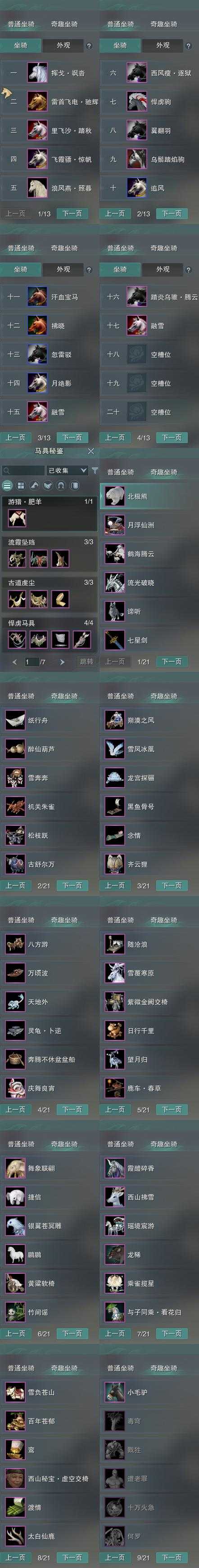 【坐骑】17个[踏炎腾云, 西风瘦逐狱, 飞霞骠惊帆, 里飞沙踏秋, 挥戈飒沓, 雷首飞电驰辉, 乌鬃踏焰驹]