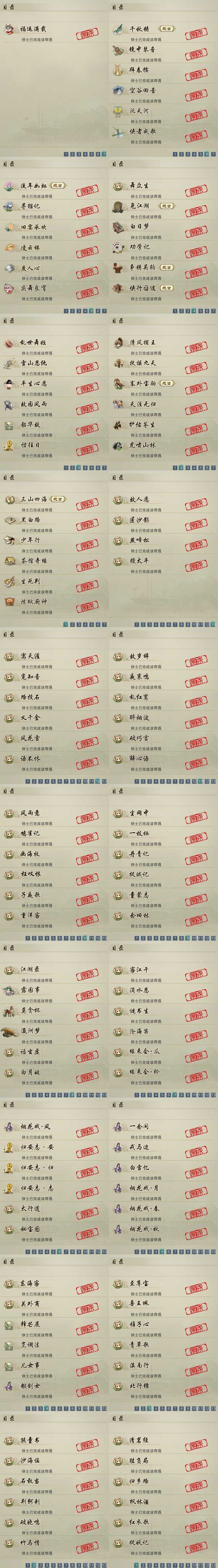【奇遇】37个[白日梦, 天涯无归, 三山四海, 劝学记, 雪山恩仇, 兔江湖, 平生心愿, 黑白路, 乱世舞姬, 惜往日, 塞外宝驹, 争铸吴钩, 韶华故, 虎啸山林, 护佑苍生, 少年行, 故园风雨, 扶摇九天, 流年如虹, 舞众生, 清风捕王, 寻猫记, 侠行囧途, 茶馆奇缘, 庆舞良宵, 生死判, 千秋铸, 凌云梯, 炼狱厨神, 度人心]