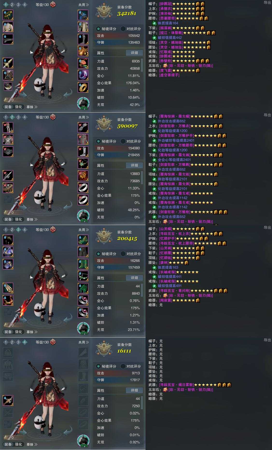 【装备】130级,装备一342181,傲血战意PVP590097,装备三200415,装备四16111