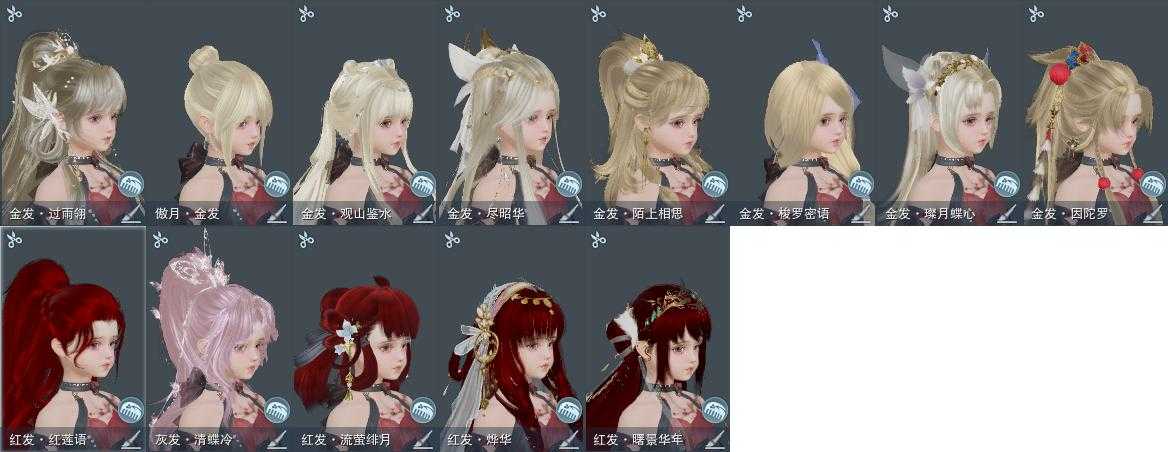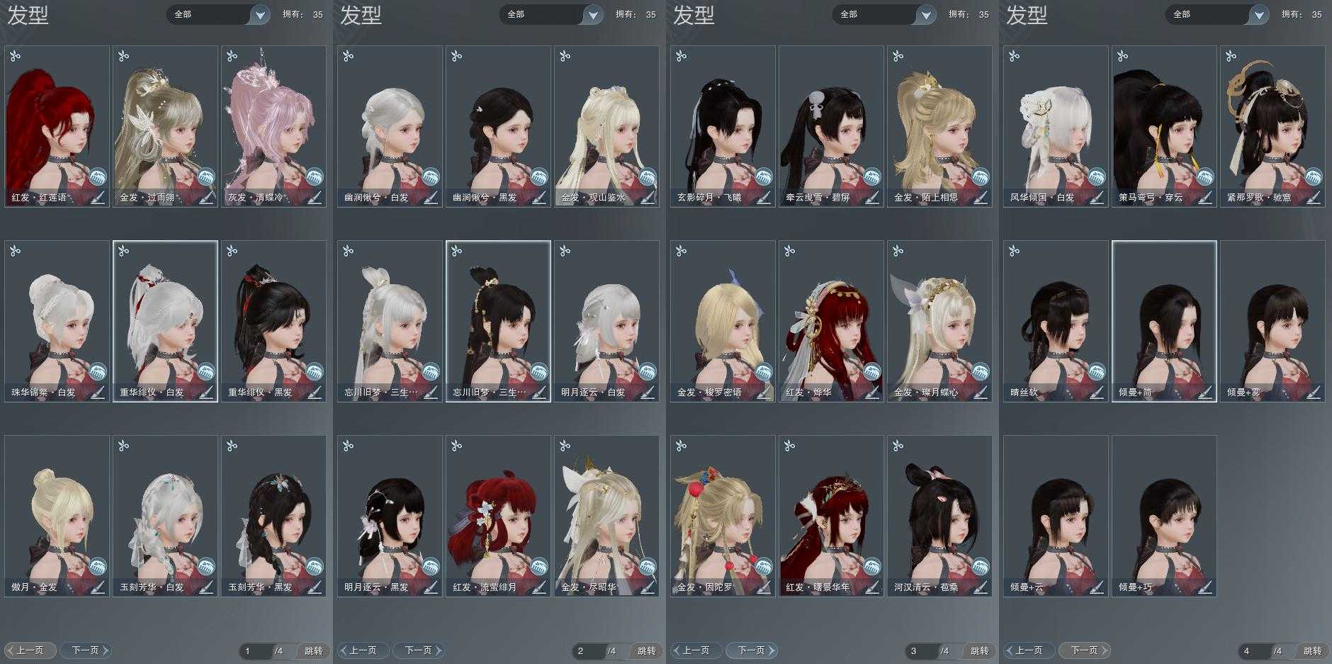【发型】金发8个[狐金, 猴金, 资历金, 中秋金, 考金, 呱金, 傲月金发, 翎金], 红发5个[七红, 蝶粉, 猴红, 小资历红, 十六红], 黑发11个, 白发7个, 盒子发型[蝴蝶黑发, 粉忘川黑发, 蝴蝶白发, 粉忘川白发, 幽涧愀兮白发], 总页数4