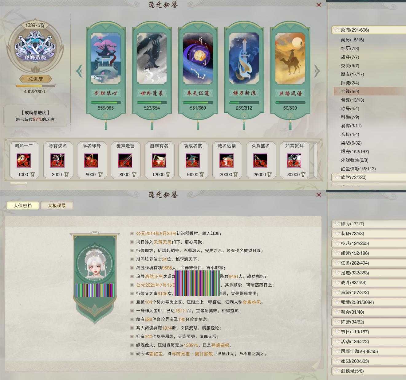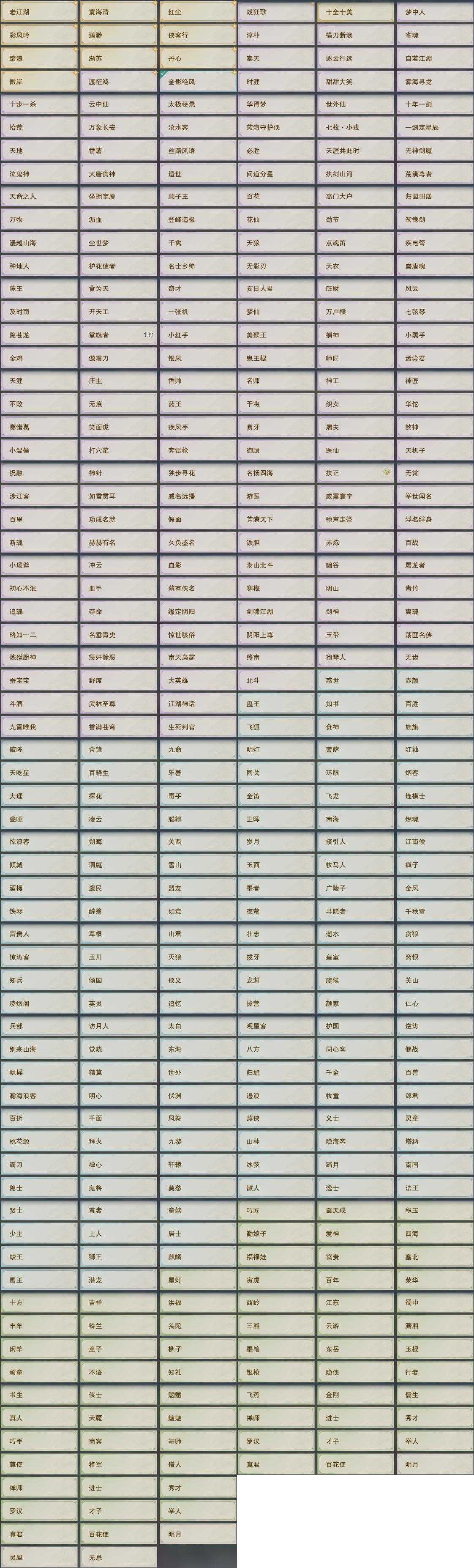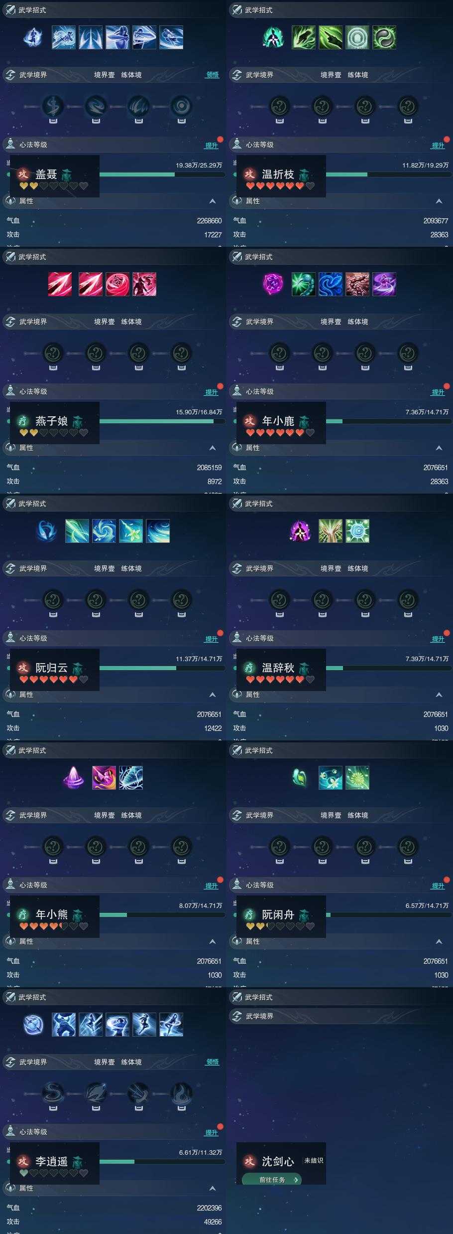 【同伴】盖聂志74级境界壹,温折枝72级境界壹,燕子娘71级境界壹,年小鹿70级境界壹,阮归云70级境界壹,温辞秋70级境界壹,年小熊70级境界壹,阮闲舟70级境界壹,李逍遥68级境界壹,沈剑心级