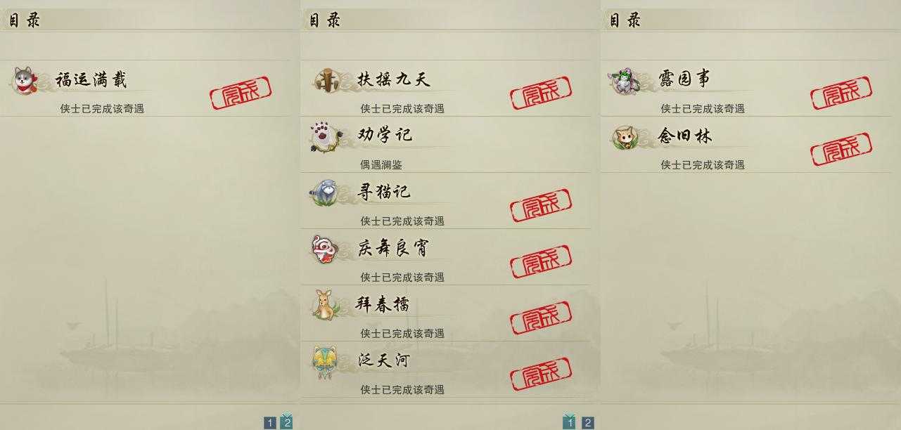【奇遇】7个[劝学记, 扶摇九天, 寻猫记, 庆舞良宵, 泛天河, 拜春擂, 福运满载]