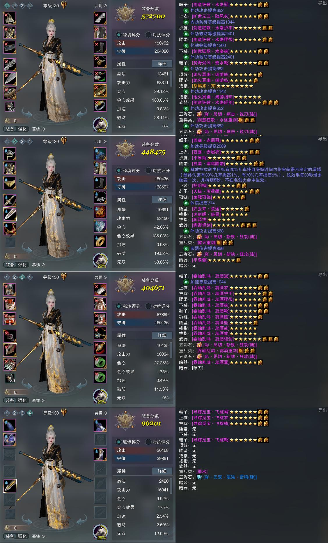 【装备】130级,山居剑意/问水诀PVP572700,山居剑意/问水诀PVE448475,山居剑意/问水诀PVP404671,装备四96201
