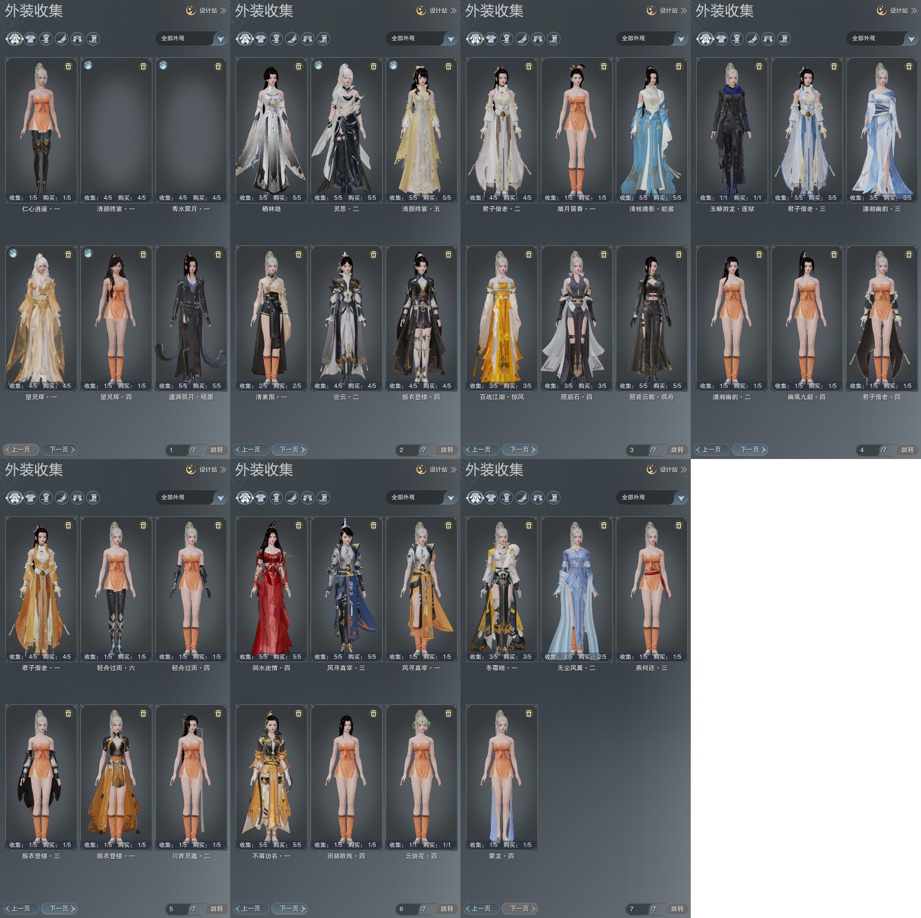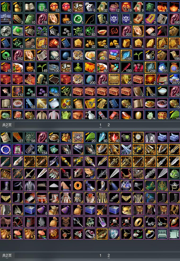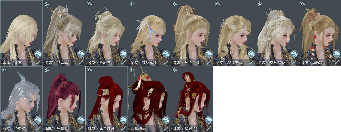 【发型】金发8个[狐金, 猴金, 资历金, 鼠金, 鸡金, 蝶金, 三代金, 玄江金发], 红发5个[紫发, 猴红, 鸡红, 小资历红, 三代灰银], 黑发26个, 白发19个, 盒子发型[晴岚绘黑发, 白楼兰黑发, 黑如归黑发, 飞皇黑发, 二代乘风黑发, 五代七夕黑发, 晴岚绘白发, 白楼兰白发, 飞皇白发, 二代乘风白发, 五代七夕白发, 黑椿山黑发, 黄沧洲盒黑发, 白幽馥黑发, 游龙盒黑发, 婚纱盒黑发, 游龙盒白发, 熊猫黑发, 茄盒黑发, 婚纱盒白发, 黑鹭黑发, 龙吟盒黑发, 兰陵盒黑发, 熊猫白发, 茄盒白发, 黑鹭白发, 龙吟盒白发, 兰陵盒白发, 黄上火黑发, 柿盒白发, 黄上火白发, 墨龙盒黑发, 墨龙盒白发], 总页数7