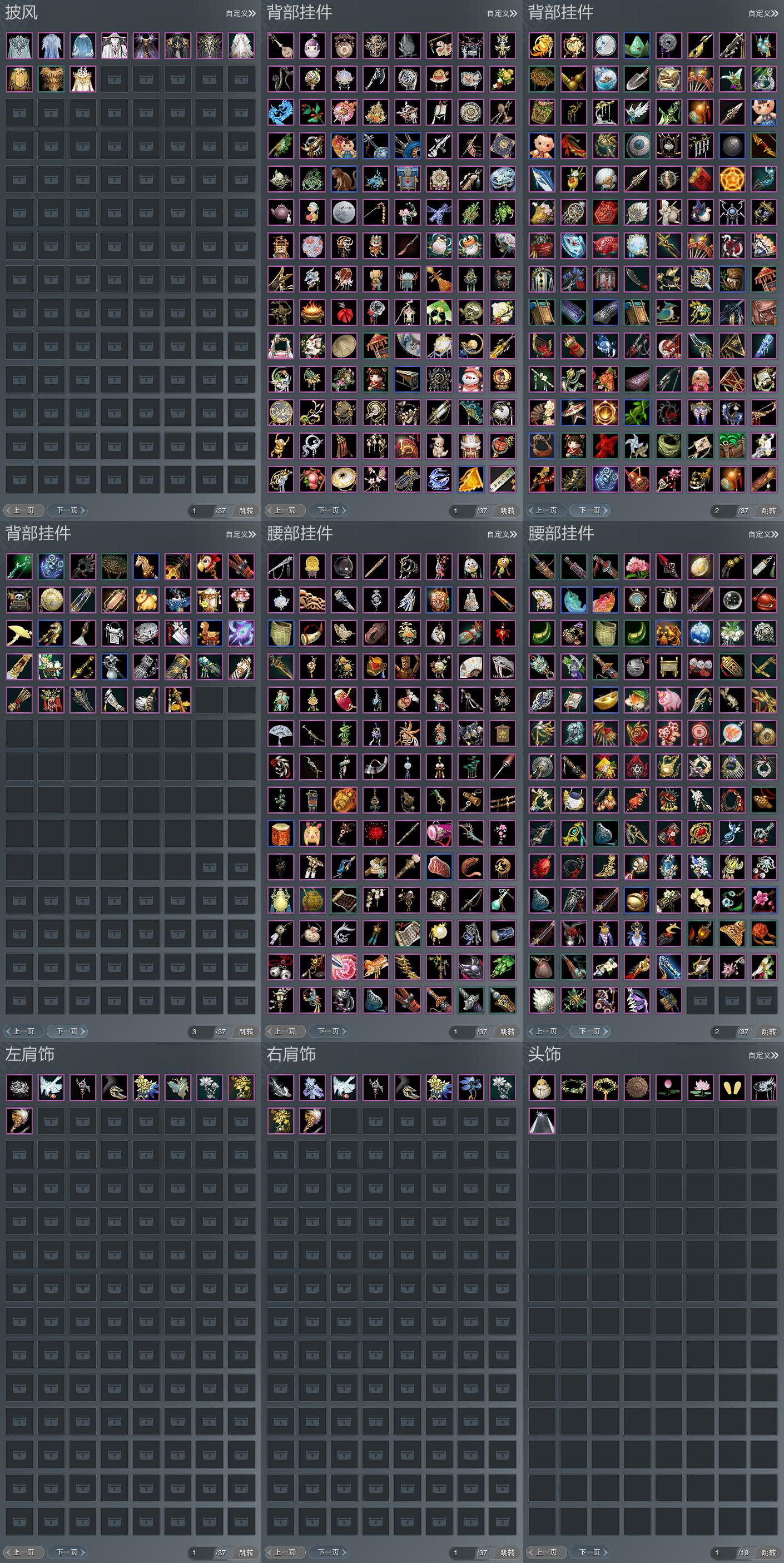 【肩饰】9左,10右,[绝代仙·墨楼·左, 鹤影天青·左, 云旌望捷·左, 歃血关山·左, 浮屠明音·左, 剑歌惊月·左][鹤影天青·右, 云旌望捷·右, 歃血关山·右, 浮屠明音·右, 剑歌惊月·右]