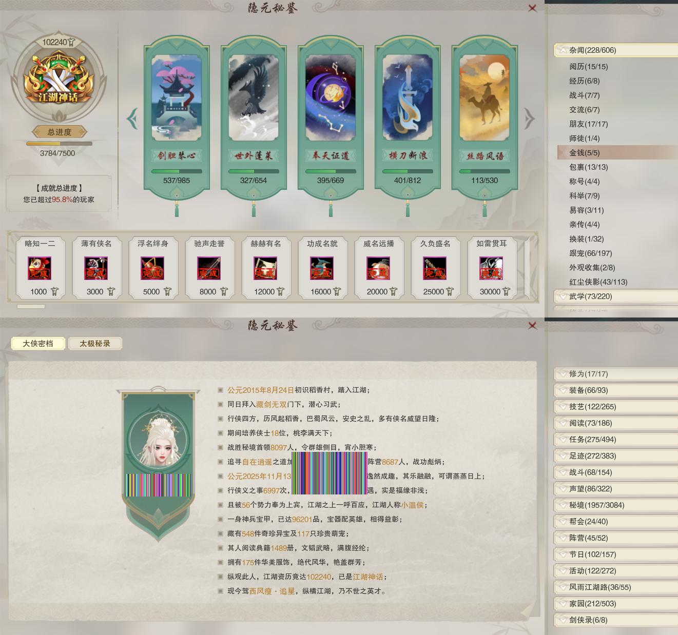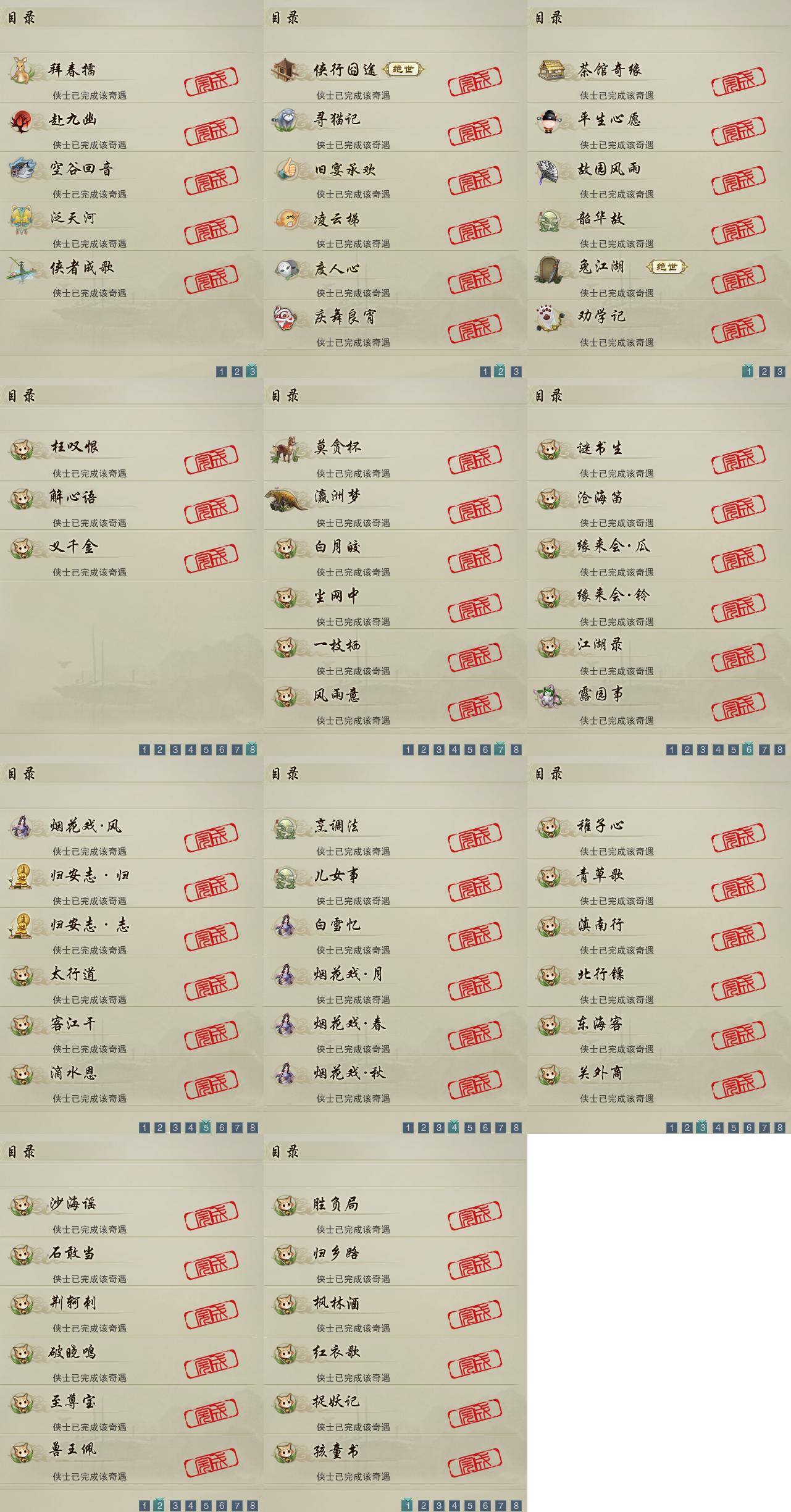 【奇遇】17个[劝学记, 平生心愿, 兔江湖, 韶华故, 故园风雨, 侠行囧途, 寻猫记, 茶馆奇缘, 庆舞良宵, 凌云梯, 赴九幽, 度人心, 空谷回音, 旧宴承欢, 泛天河, 侠者成歌, 拜春擂]