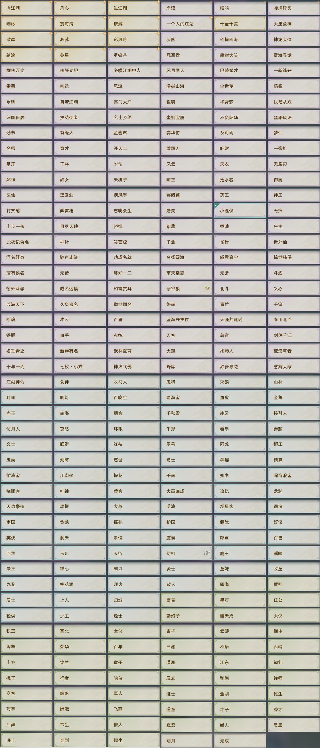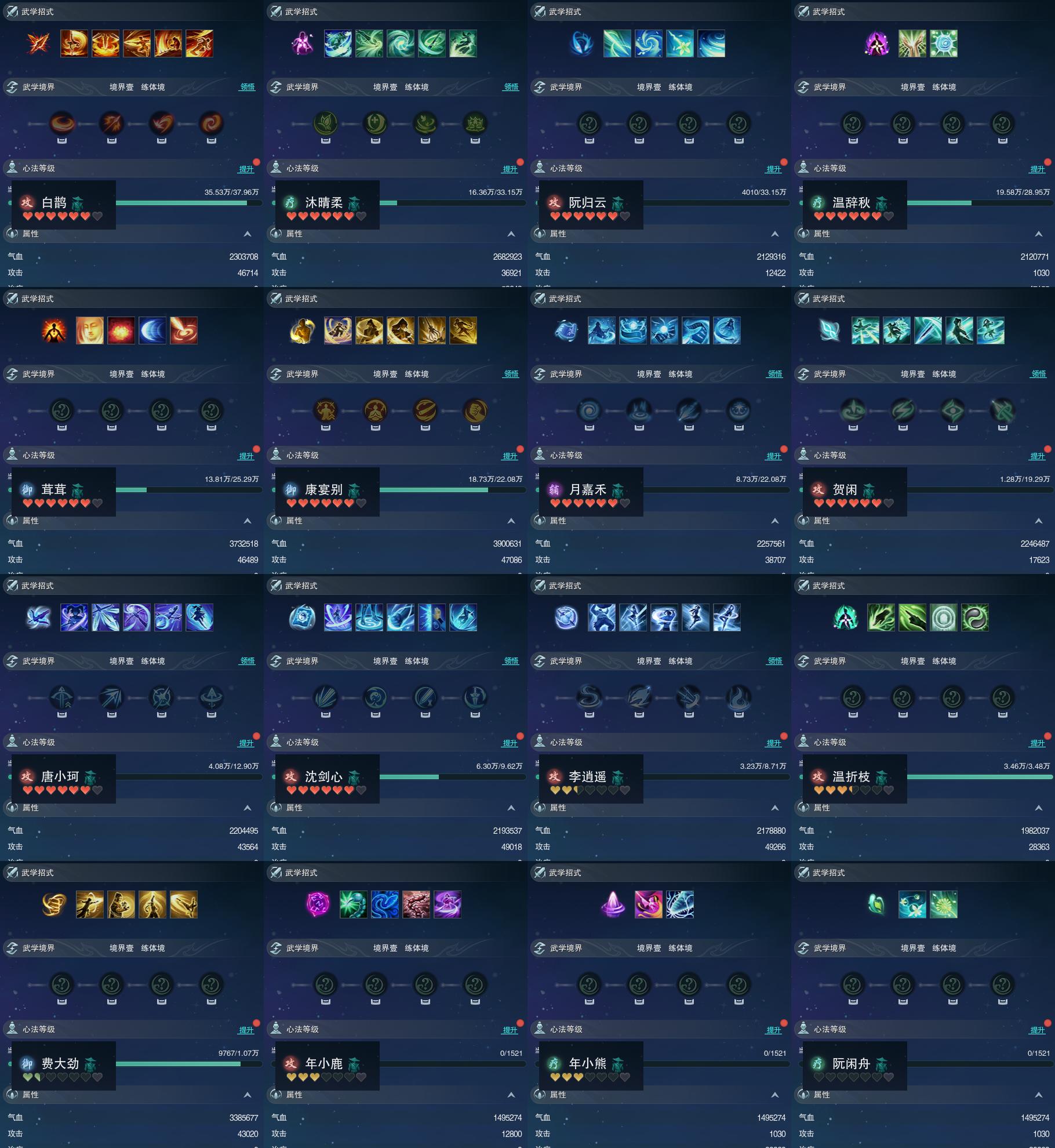 【同伴】白鹊志77级境界壹,沐晴柔76级境界壹,阮归云76级境界壹,温辞秋75级境界壹,茸茸志74级境界壹,康宴别73级境界壹,月嘉禾73级境界壹,贺闲志72级境界壹,唐小珂69级境界壹,沈剑心68级境界壹,李逍遥66级境界壹,温折枝59级境界壹,费大劲50级境界壹,年小鹿1级境界壹,年小熊1级境界壹,阮闲舟1级境界壹