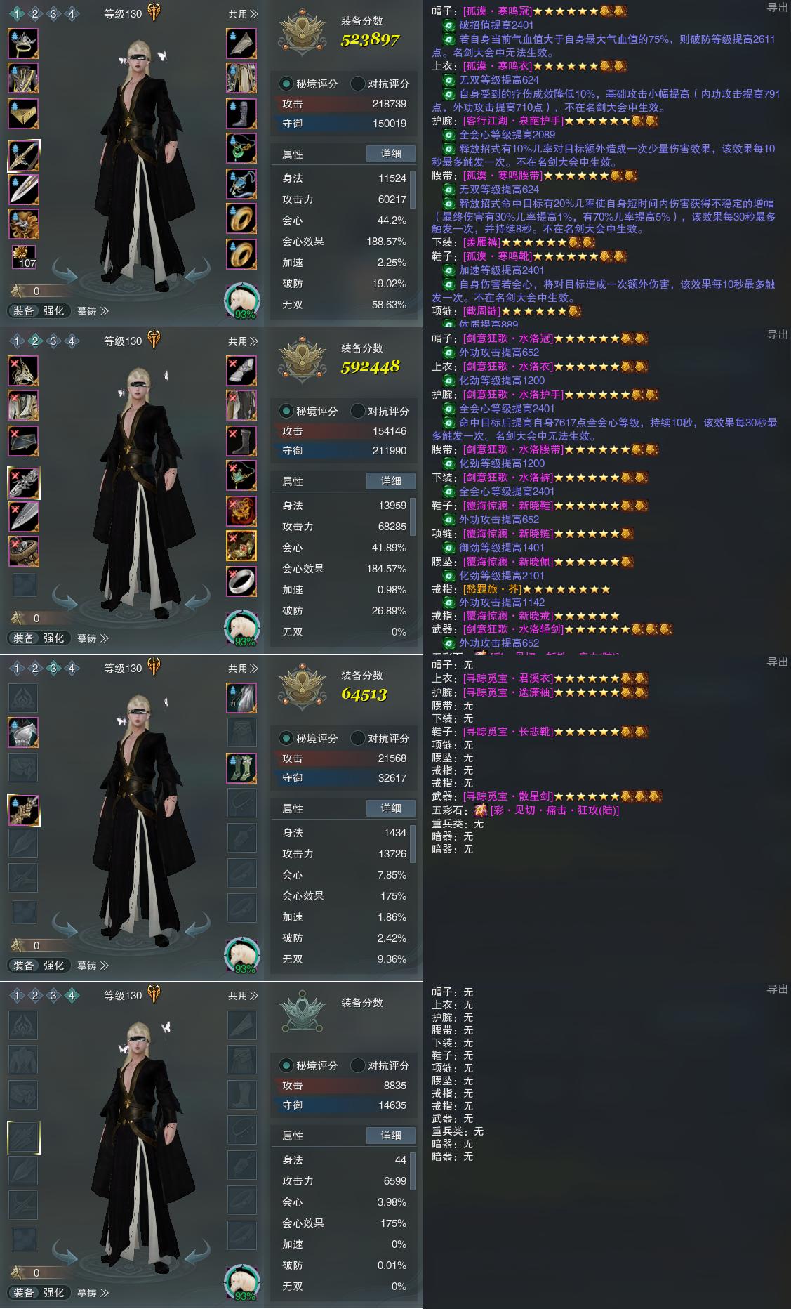 【装备】130级,山居剑意/问水诀PVE523897,山居剑意/问水诀PVP592448,装备三64513,装备四0
