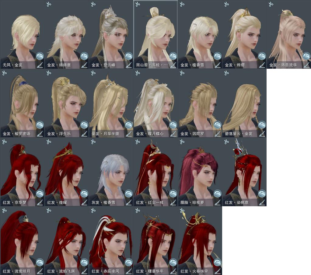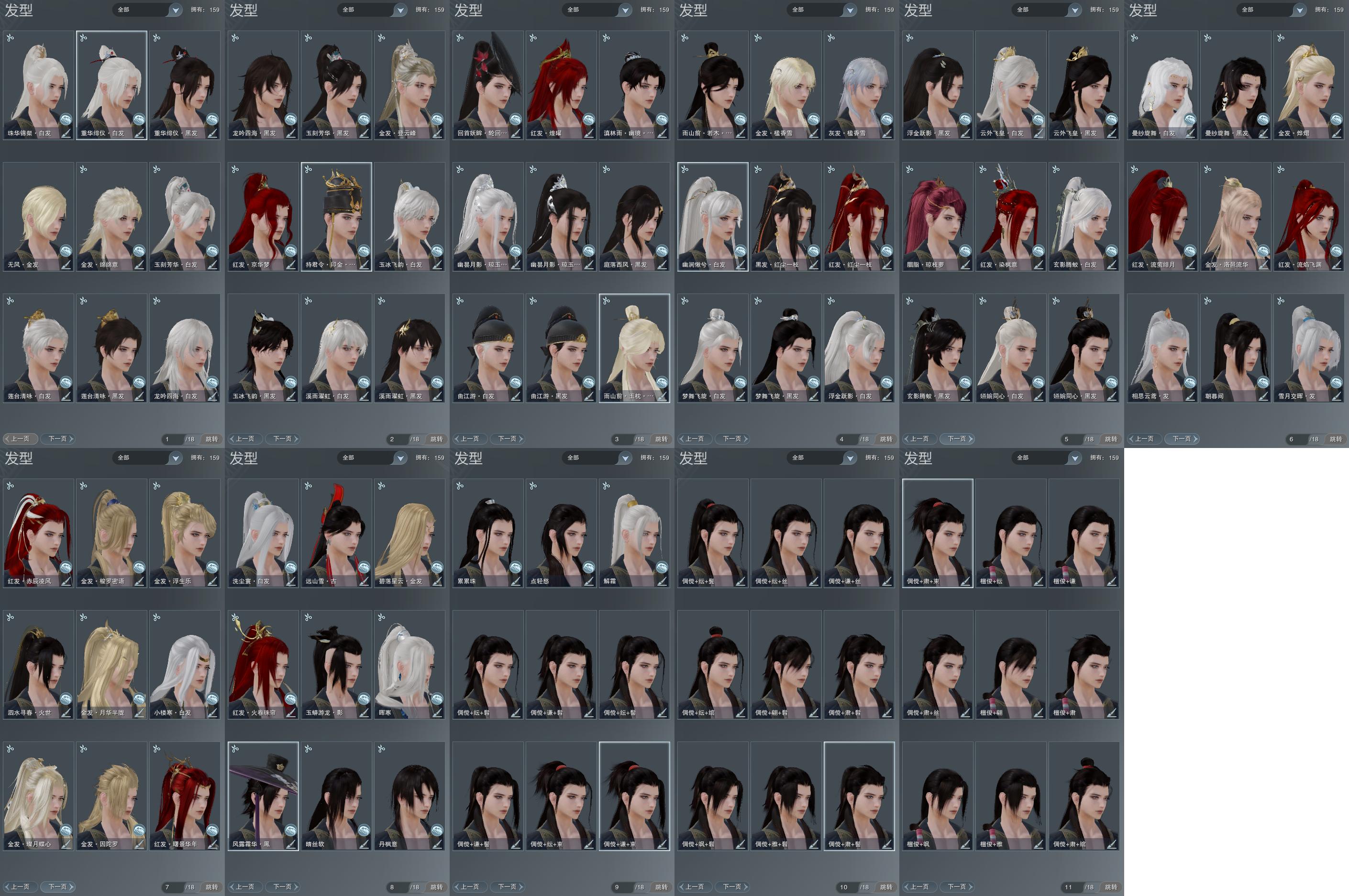【发型】金发13个[狐金, 猴金, 资历金, 鸡金, 喵金, 苏金, 玫瑰金, 猪金, 一代灰金, 三代金, 咩金, 无风金发, 白雨山前金发], 红发11个[六红, 八红, 九红, 十二红, 紫发, 猴红, 鼠红, 兔红, 小资历红, 龙红, 一代灰], 黑发29个, 白发22个, 盒子发型[曲江游白发, 丝路黑, 四代七夕黑发, 小白龙黑发, 三代七夕白, 雪月白发, 丝路白, 四代七夕白发, 飞皇黑发, 小白龙白发, 飞皇白发, 小金龙黑发, 小熊黑发, 小金龙白发, 十二黑, 小熊白发, 紫雨山前黑发, 曲江游黑发, 白幽昙黑发, 幽涧愀兮白发, 黑傣族黑发, 白幽昙白发, 红黑妖眸盒黑发, 虹猫盒黑发, 蓝兔盒黑发, 虹兔盒白发, 金持君盒黑发, 蓝兔盒白发, 龙吟盒黑发, 莲台盒黑发, 龙吟盒白发, 莲台盒白发], 总页数11