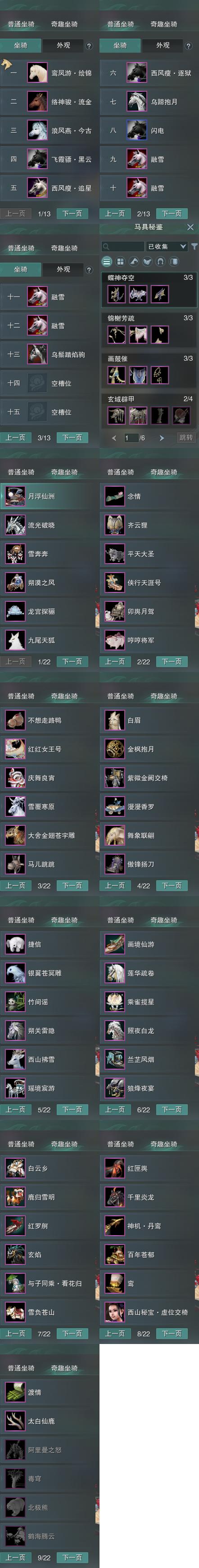 【坐骑】13个[西风瘦逐狱, 西风瘦追星, 飞霞骠黑云, 乌蹄抱月, 络神骏流金, 鸾凤游绘锦, 浪风燕今古, 乌鬃踏焰驹]