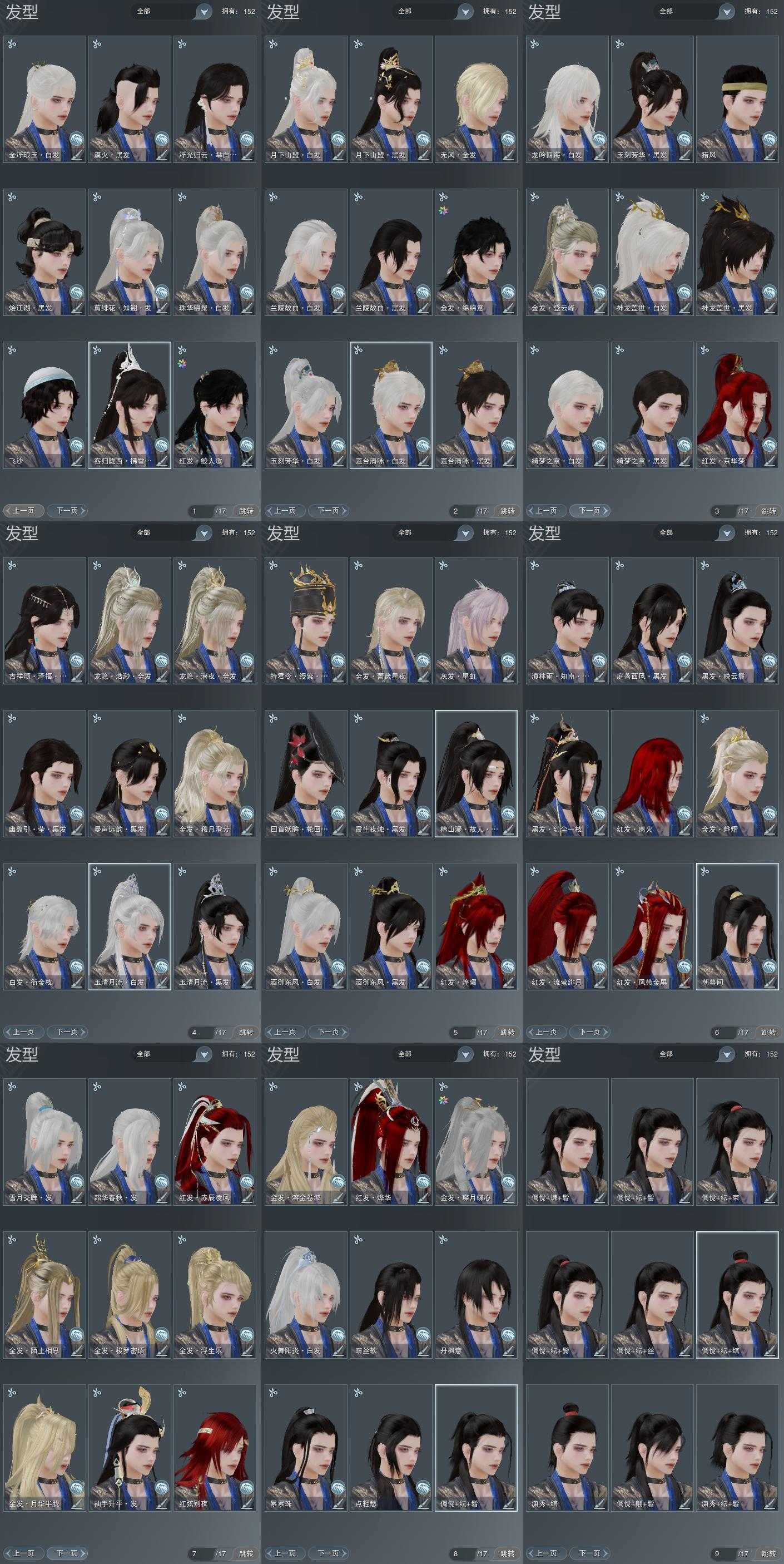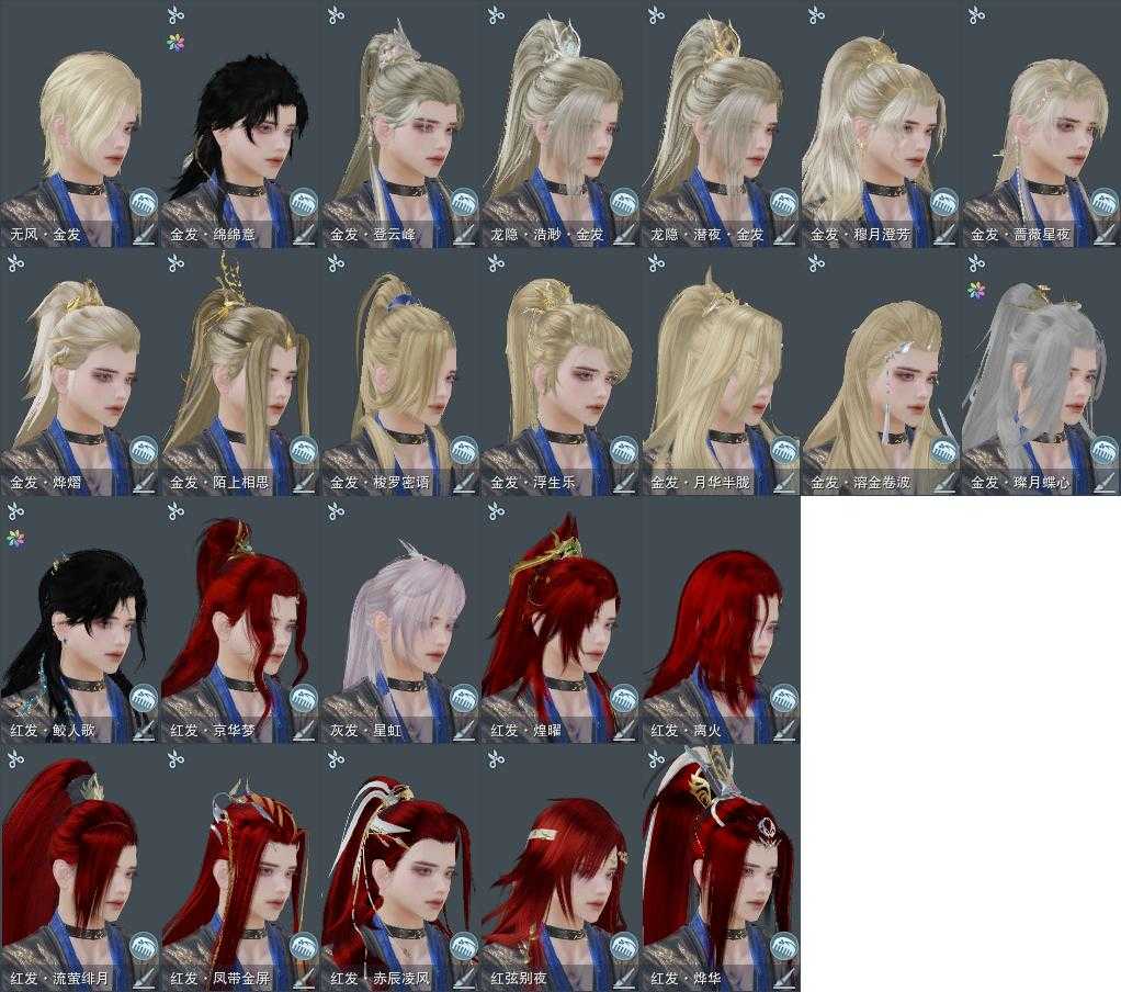 【发型】金发14个[狐金, 资历金, 鸡金, 蝶金, 喵金, 考金, 猪金, 蔷薇金, 穆金, 三代金, 咩金, 无风金发, 绿龙隐金发, 黑龙隐金发], 红发10个[七红, 八红, 鸡红, 狗红, 兔红, 小资历红, 龙红, 大资历红, 十五红, 二代灰], 黑发31个, 白发16个, 盒子发型[元宵黑, 二代七夕白, 雪月白发, 十二黑, 蓝傣族黑发, 卿酒盒黑发, 黑椿山黑发, 红黑妖眸盒黑发, 卿酒盒白发, 紫持君盒黑发, 八七盒黑发, 白幽馥黑发, 八七盒白发, 红藏袍黑发, 婚纱盒黑发, 熊猫黑发, 婚纱盒白发, 莲台盒黑发, 兰陵盒黑发, 熊猫白发, 九七黑发, 龙吟盒白发, 莲台盒白发, 兰陵盒白发, 九七白发, 白陇西黑发, 白浮光黑发], 总页数9