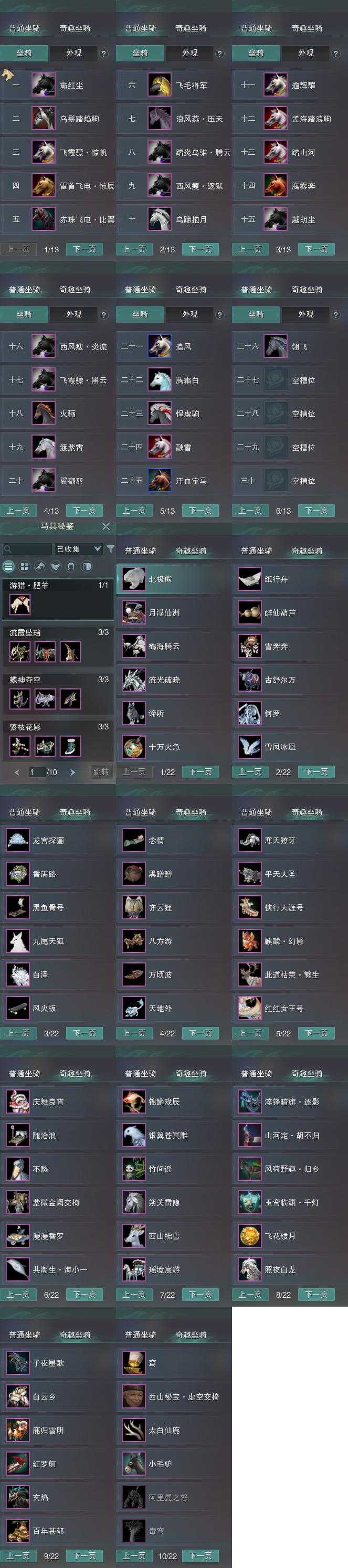 【坐骑】26个[踏炎腾云, 西风瘦炎流, 赤珠比翼, 西风瘦逐狱, 飞霞骠惊帆, 飞毛将军, 飞霞骠黑云, 乌蹄抱月, 霸红尘, 雷首飞电惊辰, 乌鬃踏焰驹]