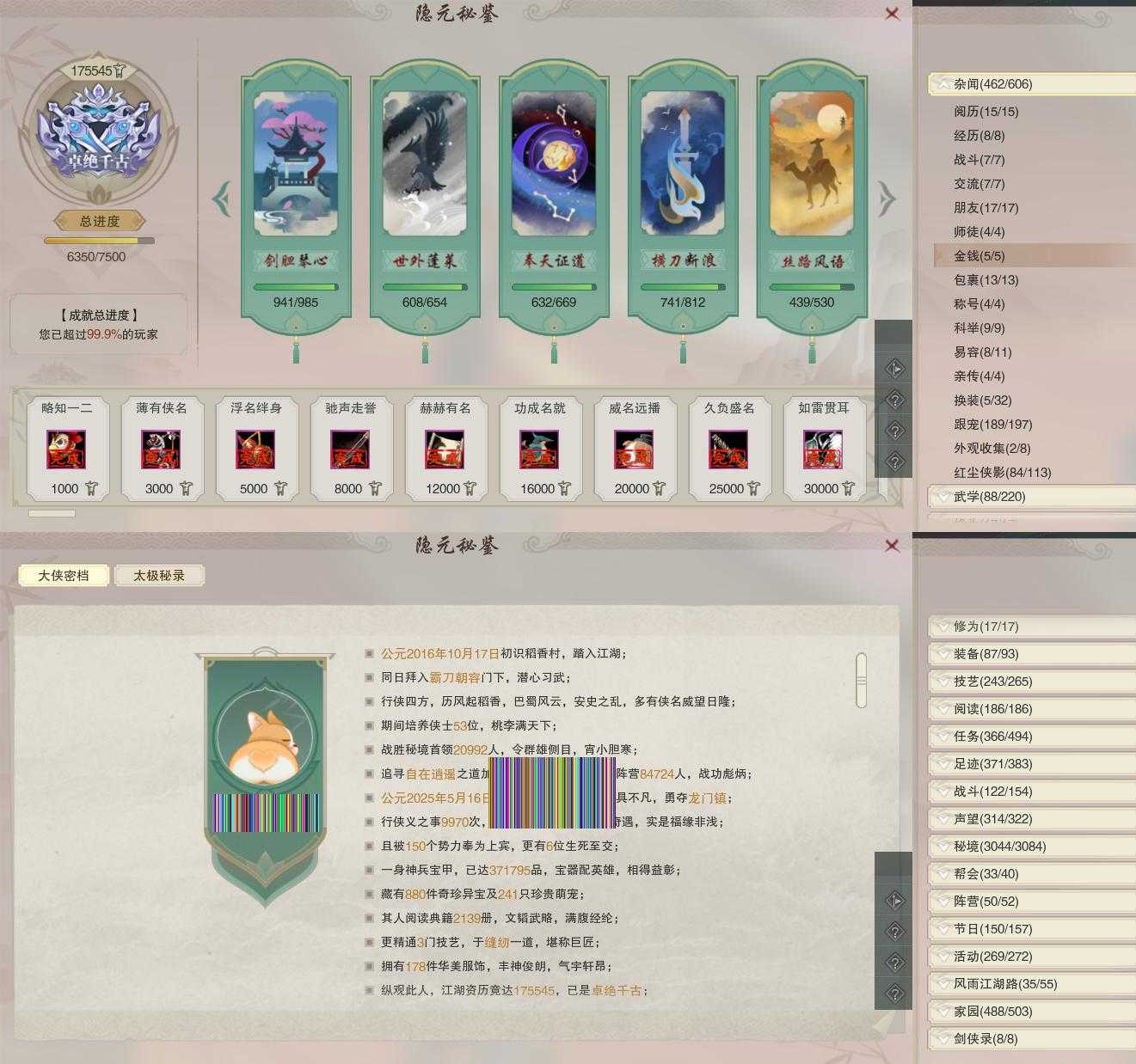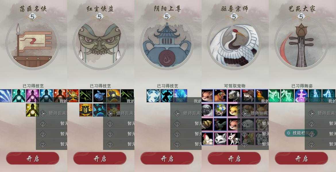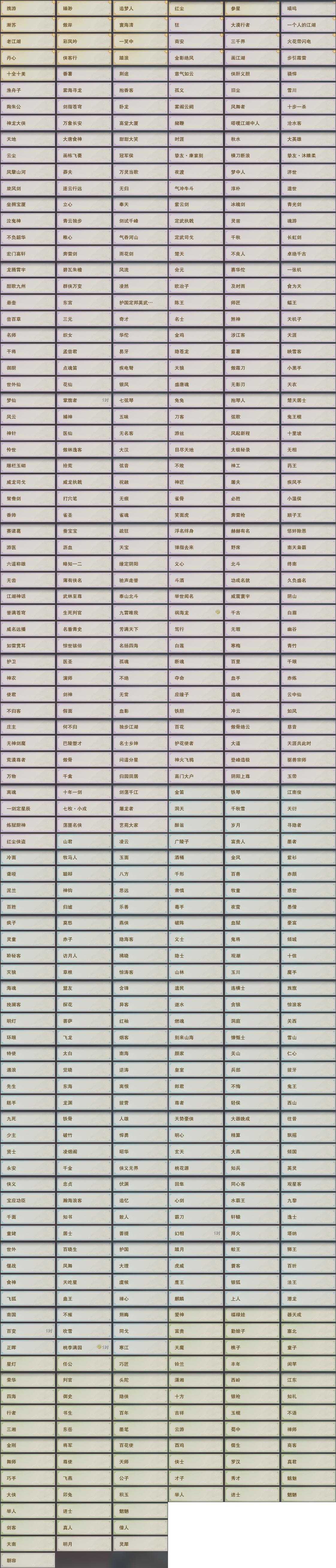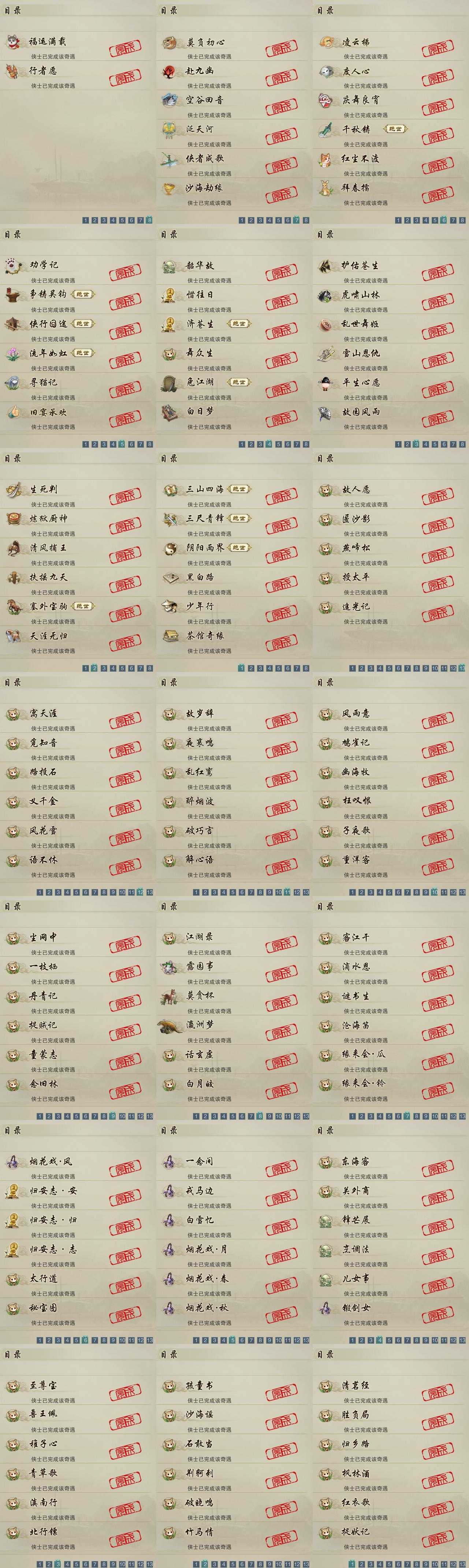 【奇遇】43个[白日梦, 天涯无归, 三山四海, 劝学记, 雪山恩仇, 阴阳两界, 莫负初心, 兔江湖, 平生心愿, 黑白路, 惜往日, 乱世舞姬, 塞外宝驹, 争铸吴钩, 韶华故, 虎啸山林, 济苍生, 护佑苍生, 少年行, 故园风雨, 扶摇九天, 三尺青锋, 流年如虹, 舞众生, 清风捕王, 侠行囧途, 寻猫记, 茶馆奇缘, 庆舞良宵, 生死判]