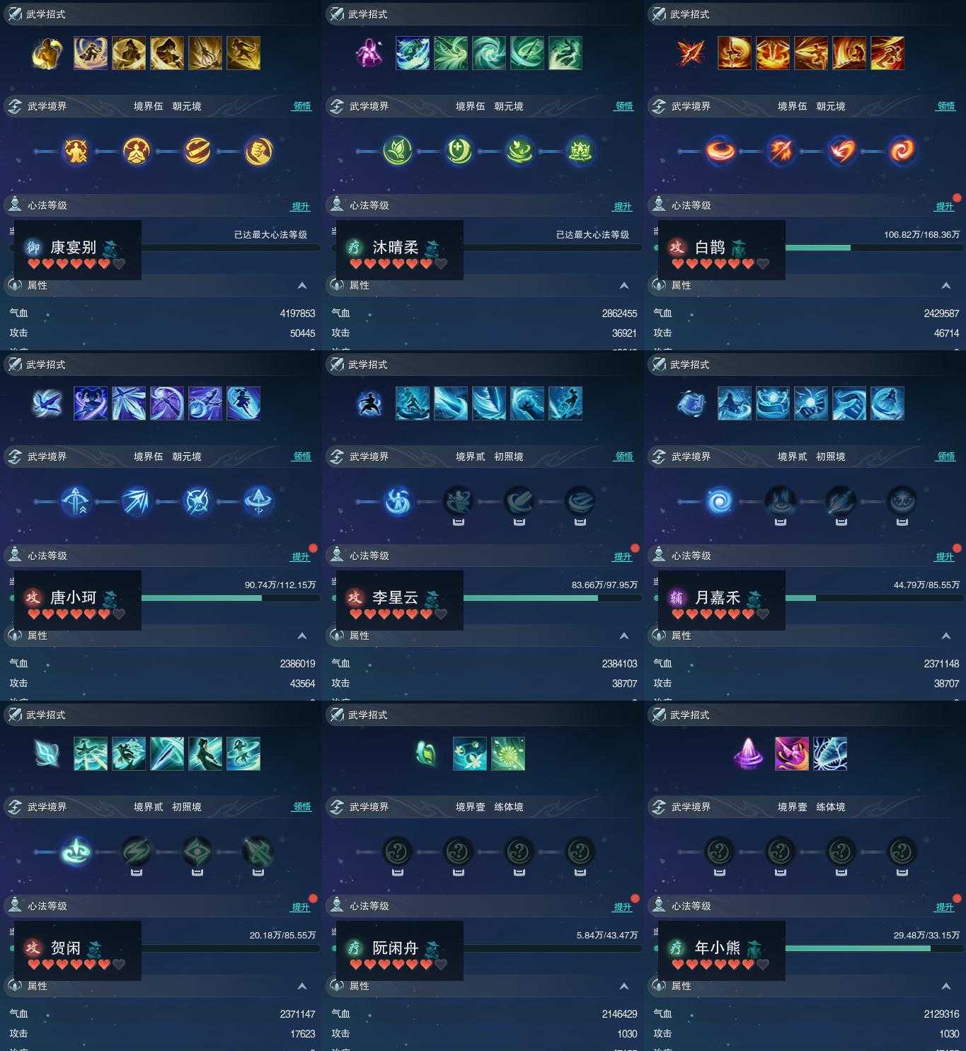 【同伴】康宴别90级境界伍,沐晴柔90级境界伍,白鹊志88级境界伍,唐小珂85级境界伍,李星云84级境界贰,月嘉禾83级境界贰,贺闲意83级境界贰,阮闲舟78级境界壹,年小熊76级境界壹