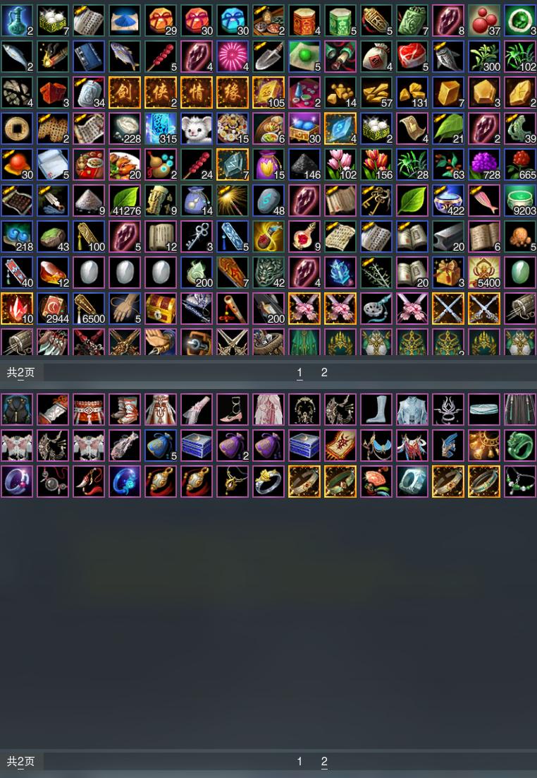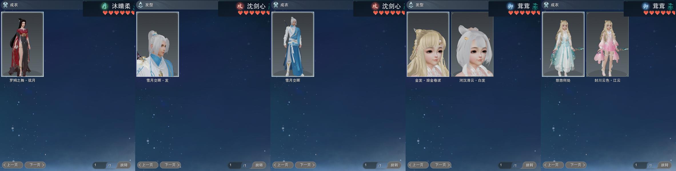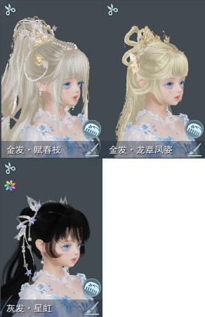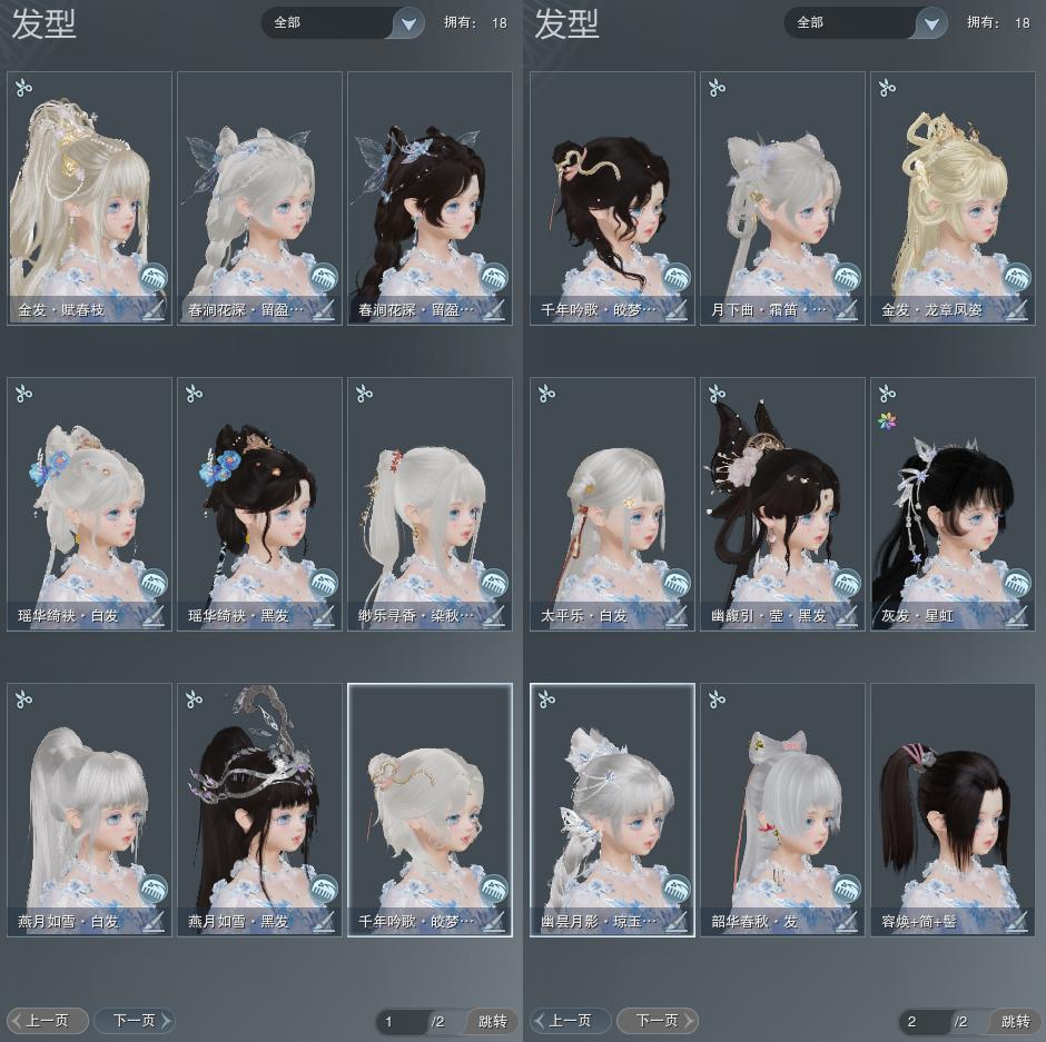 【发型】金发3个[蝶金, 龙金, 蛇金], 红发1个[二代灰], 黑发5个, 白发11个, 盒子发型[二代七夕白, 雪月白发, 白幽昙白发, 白幽馥黑发, 白蛇盒黑发, 紫月下白发, 白蛇盒白发, 燕月盒黑发, 红寻香白发, 瑶华盒黑发, 蓝蝴蝶黑发, 燕月盒白发, 瑶华盒白发, 蓝蝴蝶白发], 总页数2