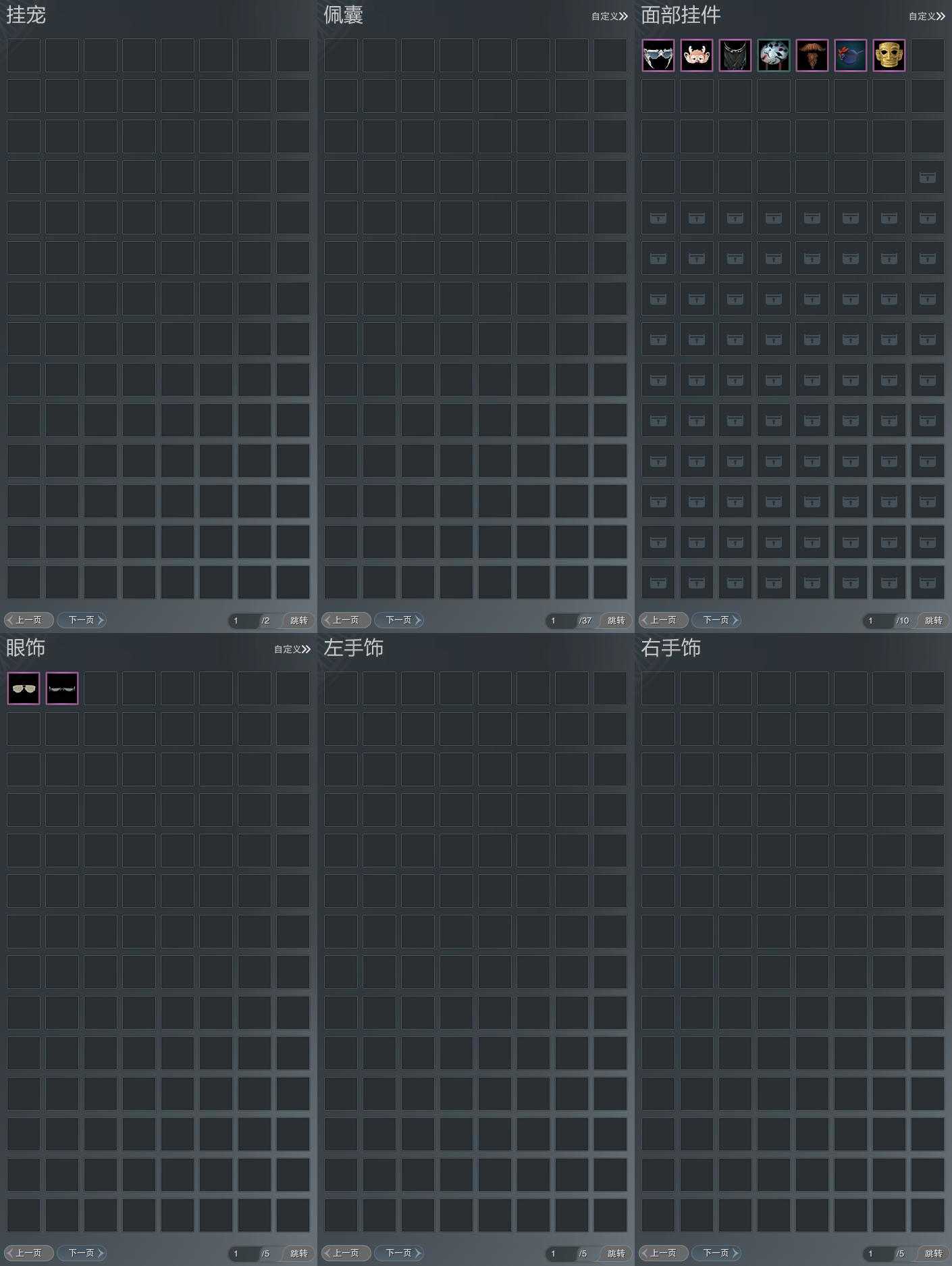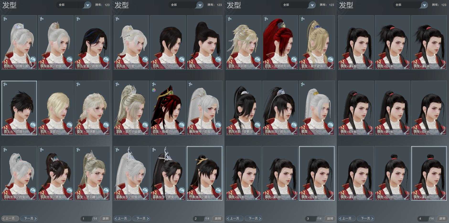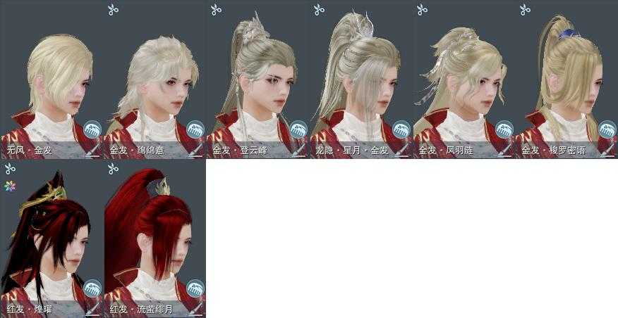 【发型】金发6个[资历金, 凤金, 三代金, 咩金, 无风金发, 紫龙隐金发], 红发2个[兔红, 小资历红], 黑发9个, 白发7个, 盒子发型[竹影墨花黑发, 红梅盒黑发, 红梅盒白发, 幽涧愀兮白发, 蓝上火黑发, 蓝千山黑发], 总页数5